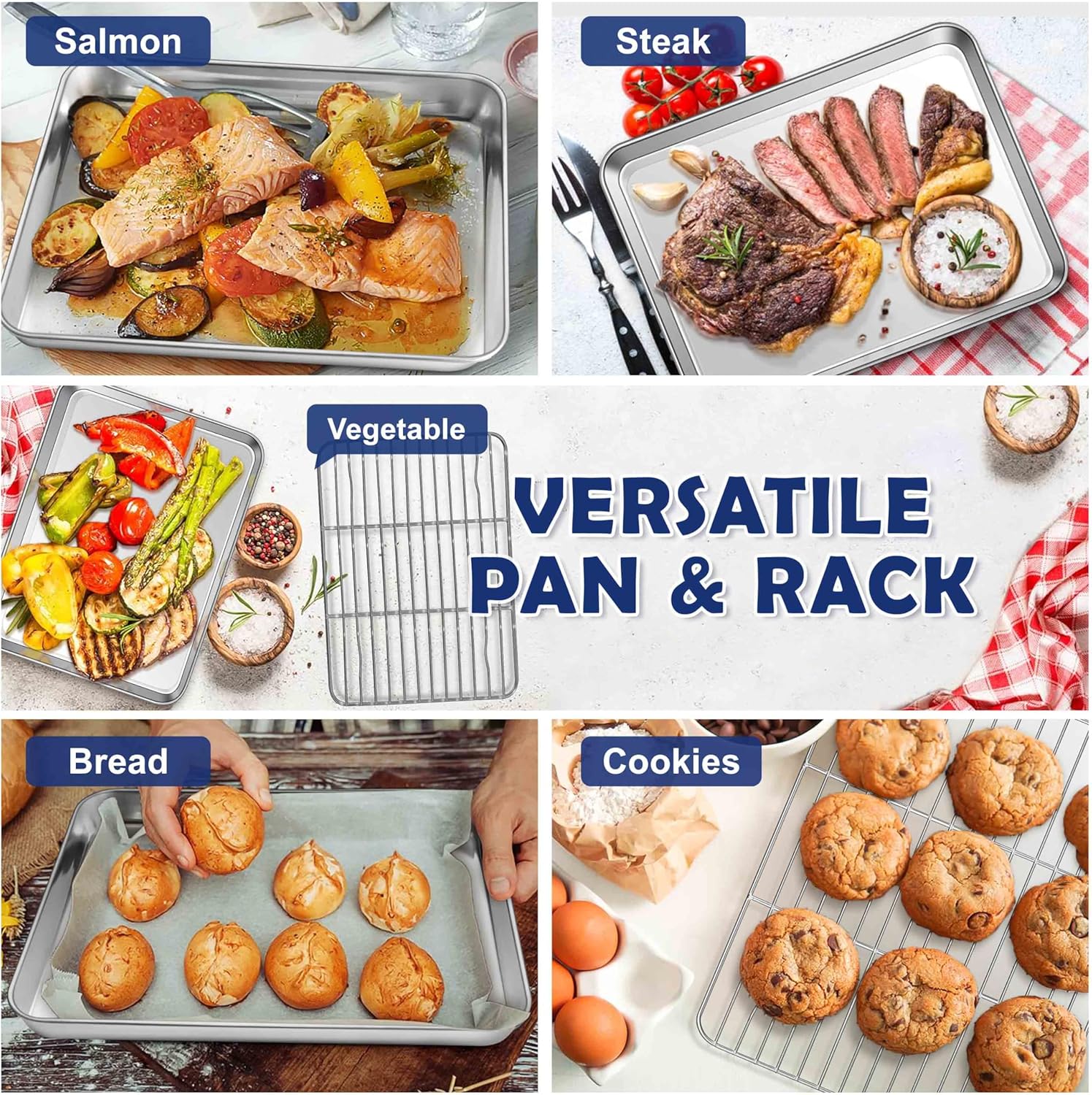 【WELL MADE】 Metal core handle wrapped with heat-proof bakelite, Firmly attached to the pot by rivets for secure grip, Smooth rolled edge easy for pouring and seal well with the lid, 3.4-inch deep side for containing more foods and avoid sauce spilling over, Exterior Brushed surface for abrasion resistance, Looks still as new after long time use. 【TEMPERED GLASS LID】 Allows you monitor the cooking process easily without opening the lid, Retaining as much flavor and nutrients as possible for greater taste, The small vents help release excess steam to prevent boil-over, also can prevent steam burns when opening the lid, The combination of dark brown glass lid makes the whole pot more attractive. 【BAKING RACK】 The wires of the baking rack are tightly welded with a small gap to prevent food from falling, 4 raised feet hold the food firmly, Fits pan perfectly, Provides good air circulation when baked with the pan, Makes the heat distribution rapidly and evenly. 【LABOR-SAVING】This premium cookie sheet with rack set is dishwasher-safe, Will greatly save the hassles of cleaning, Smooth mirror finish surface help food release easily, Round edges for no any dead corners to clean, Hand washing them with soapy water, You will also easily get a bright pan and rack set. 【VERSATILE SET】 This quality baking sheet set is designed for restaurant and family, Tray 16 x 12 x 1 inch, Rack 15.3 x 11.25 x 0.6 inch, It is a perfect size for baking and cooling cookies, jelly rolls, pizzas, Or roasting meats, draining grease, etc. From food preparation, cooking, cooling to serving, Can easily meet your daily cooking demands.