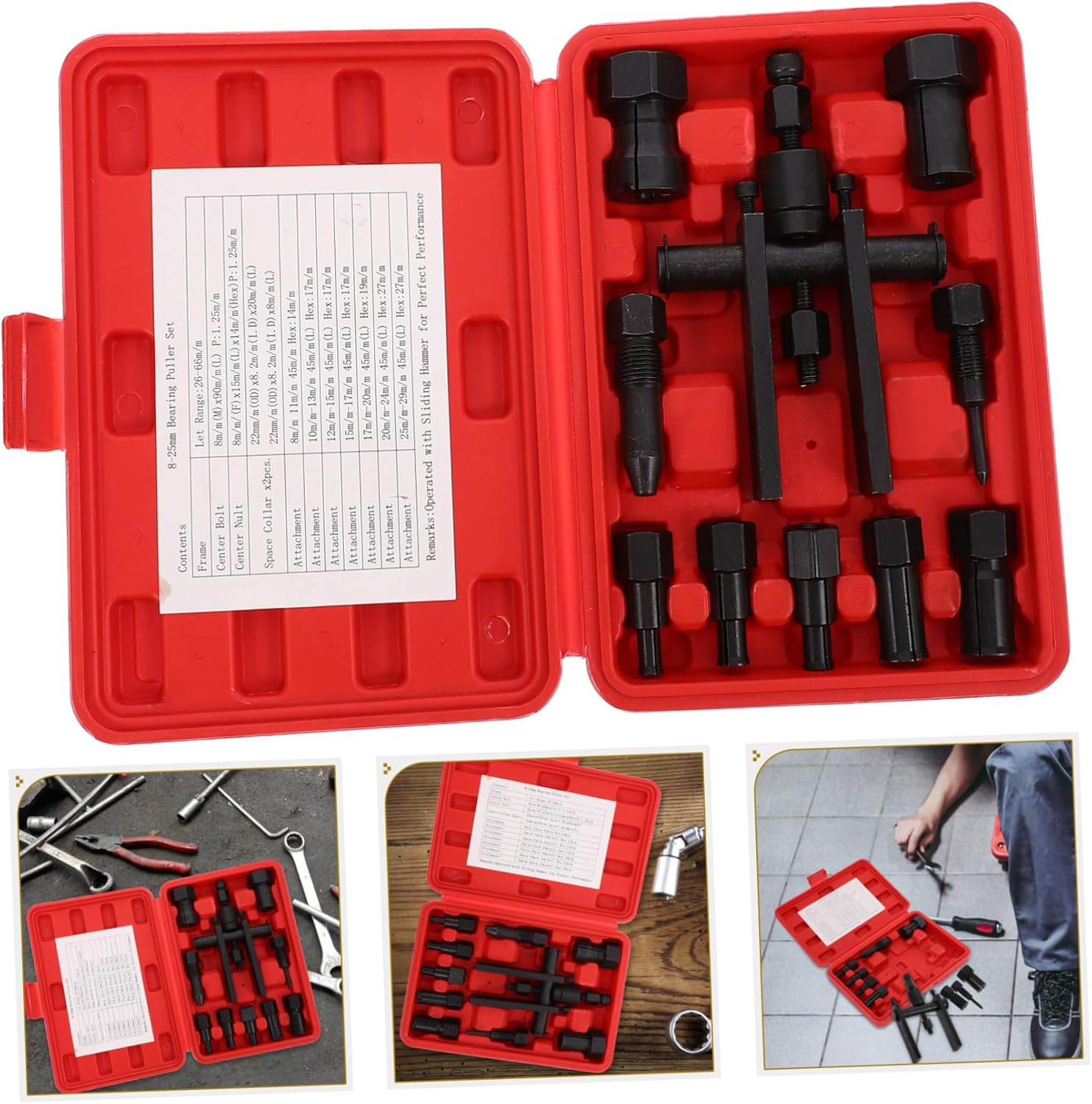 Package Include 10 x bearing pullers 1 x plastic box Features - Note: clamping range: 25-65mm Bearing Disassembly Tool. - Color: Red (box), black (puller) Puller Tool with Box. - Size: 21.80X15.00X4.50 cm/8.57X5.89X1.77 inch Motorcycle Bearing Removal Puller. - Material: Plastic (box), alloy steel (puller) Bearing Puller. - Easy to carry and store, convenient for you to use at any time. This is motorcycle bearing remover kit tool Two-Jaw Bearing Removal Puller. - It can be well applied to your maintenance and disassembly work to provide you with more convenience Bearing Removing Puller. - It makes assembly very easy and , and will be a choice for your disassembly and repair tools Motorcycle Two-Jaw Bearing Puller. - craftsmanship, durable and practical, toughness, you can use it with confidence Motorcycle Bearing Puller. - It is made of high grade material, which is not easy to damage or break, safe and reliable Bearing Disassembly Puller.Goods DescriptionPractical Bearing Puller Are you looking for professional and two-jaw bearing puller? Are you looking for a sturdy, trustworthy tool that can perform multiple tasks at the same time? If so, please look no further! Our professional inner bearing puller will surely meet your needs.Bearing Disassembly Puller This is one of your choices