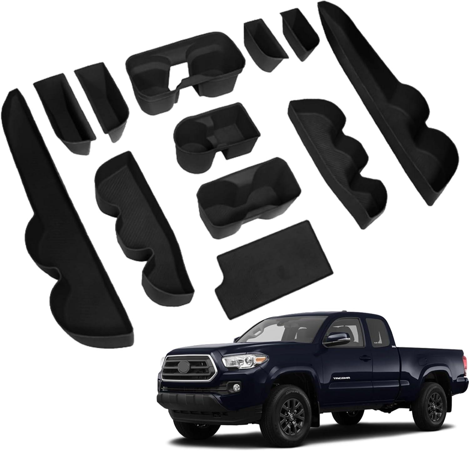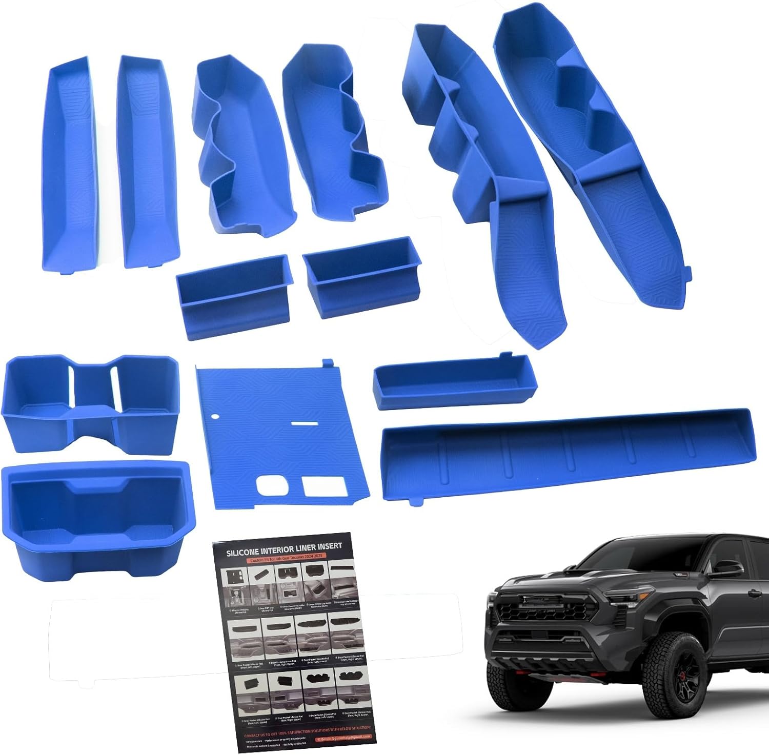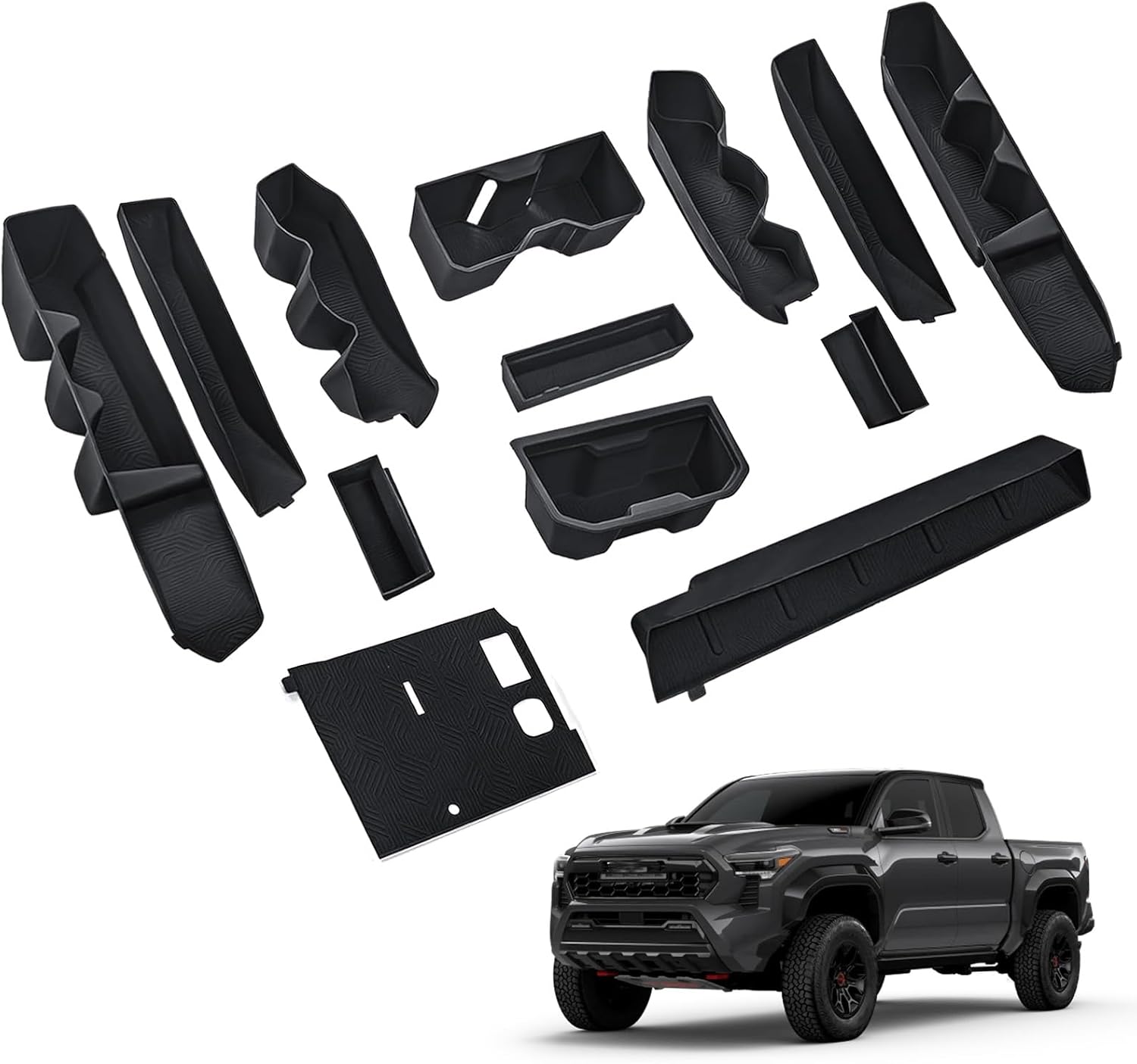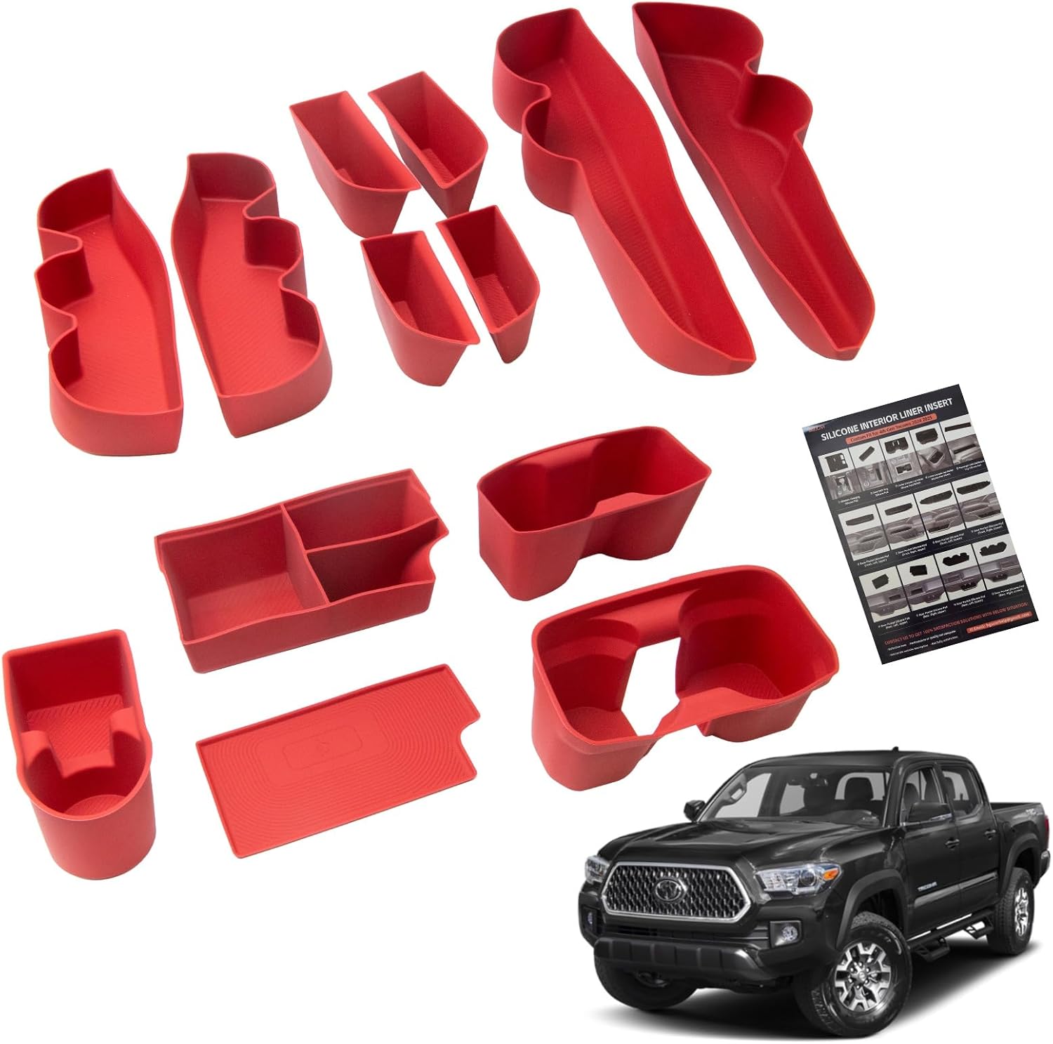 | Included Components | 1x Wireless Charging silicone pad, 1x Gear Shift Tray pad, 1x passenger side dashboard storage box silicone pad, 2x Center Console Cup Holder silicone pad (front,rear), 4x Lower Door Pocket silicone pad (front left, front right, rear left, rear right), 4x Upper Door Pocket silicone pad (front left, front right, rear left, rear right) |