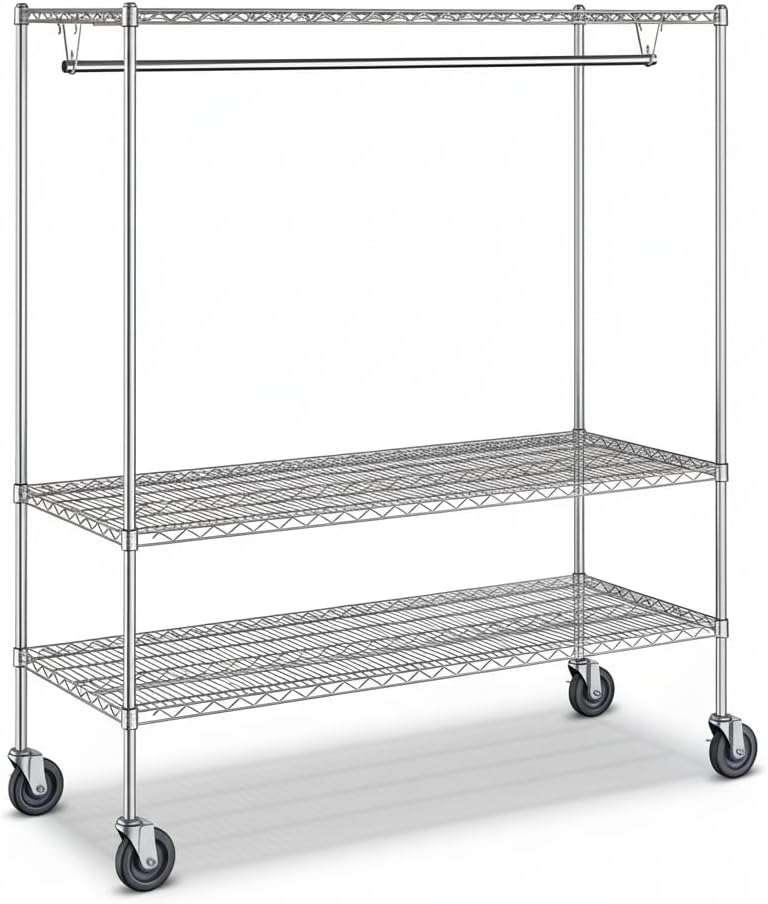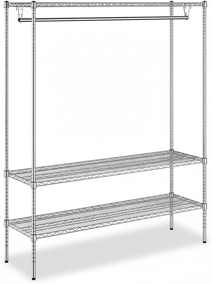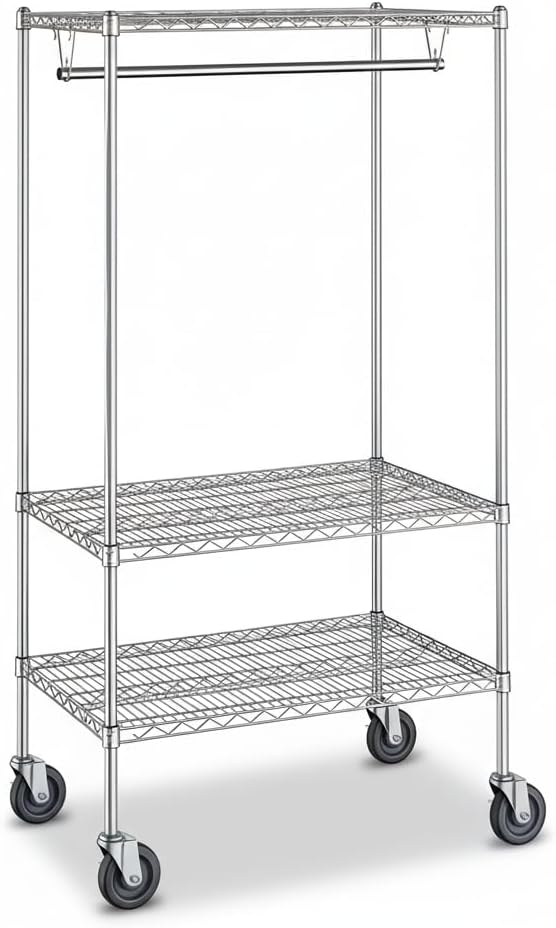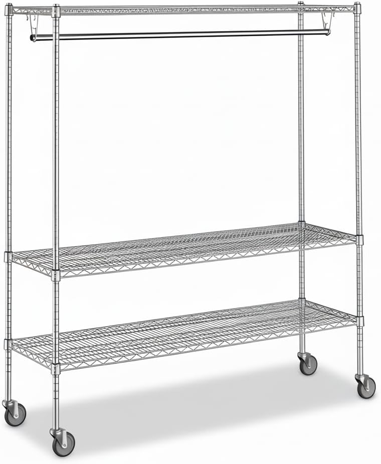 Heavy Duty Chrome Clothes Rack: This 18" x 72" x 70" garment rack is built from chrome-plated steel for strength and durability. Designed for both commercial and residential use, it provides reliable storage for hotels, event venues, offices, restaurants, or home entryways.Spacious Hanging Bar for Garments: The 72" garment tube offers plenty of room for coats, jackets, uniforms, or costumes. Guests and staff can easily hang their clothing, keeping spaces organized and clutter-free.Three Sturdy Shelves for Accessories: Equipped with (3) 18" x 72" wire shelves, this rack holds handbags, shoes, hats, packages, and other personal items. Perfect as a clothes and shoes organizer or as additional storage in high-traffic areas.Professional Chrome Finish: The polished chrome design adds a clean, professional look that fits seamlessly into lobbies, waiting rooms, theaters, or modern homes. Strong construction ensures long-lasting performance in busy environments.High Weight Capacity: With a total capacity of 1900 lb. and 600 lb. per shelf, this rack supports heavy loads without bending or losing stability. The garment hanging tube holds up to 100 lb., making it perfect for coats, jackets, and uniforms. A dependable choice for heavy duty garment storage in commercial and residential settings.Quick Assembly and Easy Maintenance: Simple setup makes installation fast and stress-free. The open wire design improves airflow, keeps items visible, and makes the shelves easy to clean.Multi-Purpose Storage Solution: From hotels, theaters, and offices to dorm rooms and family homes, this rack serves as a garment rack, coat rack, and clothes shelf all in one. Strong, versatile, and practical - the perfect choice for organized storage.