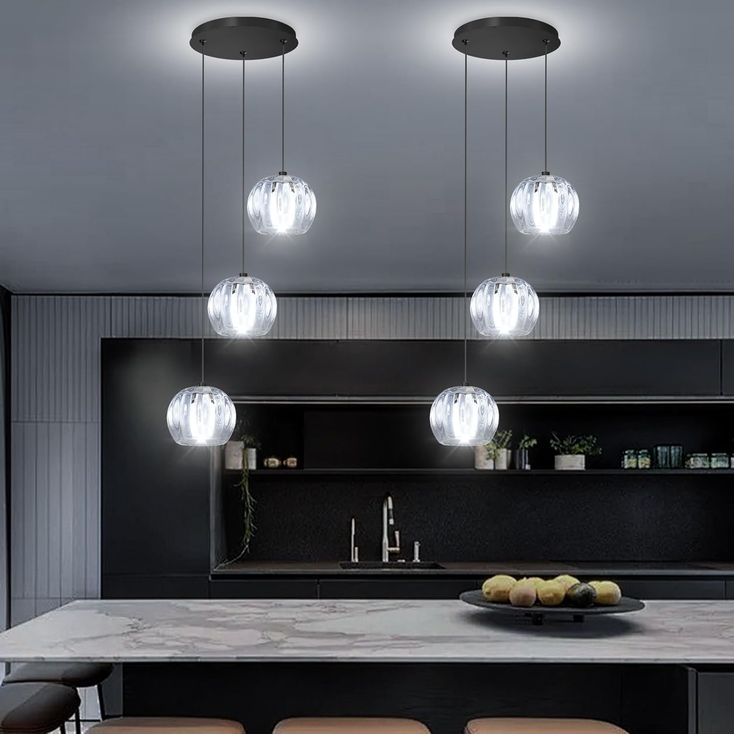 3 Light Globe Glass Pendant Light Modern LED Dimmable Chandelier Adjustable Height Pendant Lights Fixtures for Kitchen Island Living Room Foyer Black