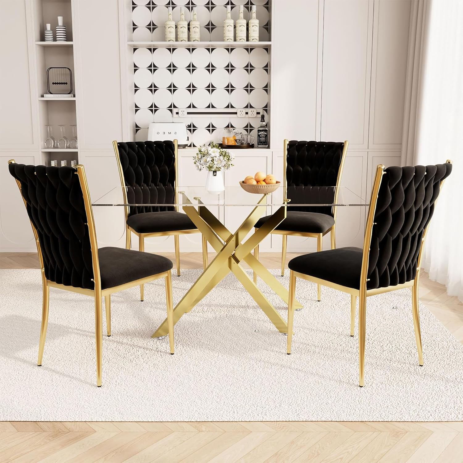 • Space-Saving Dining Set for 4: 51.18" × 29.53" rectangular glass table fits small apartments and dining spaces. The 29.92" table height matches the velvet chair seats, while the glass top reflects light to visually expand the room.