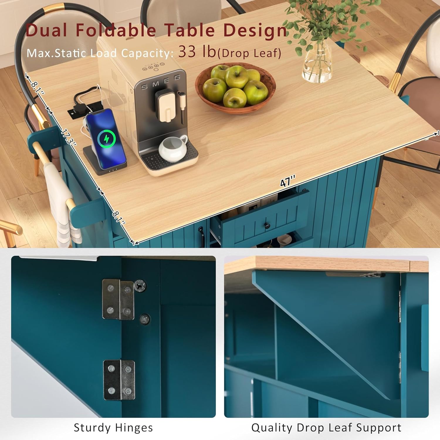 Expandable Kitchen Island with Built-in Power Outlet 3 Drawers 2 Door and Mobility on 5 WheelsDimensions & WeightOverall Dimensions: 55.75" W x 34" D x 36.5" H (with drop leaves extended)Tabletop (Not Expanded): 17.7" W x 47" LTabletop (Expanded): 34" W x 47" L (with two 7.7" drop leaves)Product Weight: 104.94 lbsMaterials & ConstructionMaterial: P2 Grade MDFFinish: Painted on the body; natural wood tone Melamine finish on the tabletopMobilityWheels: 5 universal wheels 2 of which are lockableStorage & FunctionalityStorage Layout:2 open shelf (with a vertical partition beneath the tabletop)3 drawers with 10 lbs capacity each2 side cabinets with adjustable shelving insideSide Features:1 side towel rack1 side spice rackPower Outlet: Built-in on the tabletop with 2 AC outlets (120V/12A) and 2 USB ports (5V/2A) with a 6.5-foot power cordDesigned for the kitchen but versatile enough for use in dining rooms home offices or craft roomsAssemblyAssembly Requirement: Assembly required; estimated assembly time is 40-60 minutesNumber of Packages: 1Care Instructions1. Wipe clean with a damp cloth2. Avoid using abrasive material 3. Keep the island dryKindly Consider Size and Color DifferencesPlease be noted that small size variations may occurs due to manual measurements.and color differences might occur due to screen and photography settings.Thank you for your kind understanding.