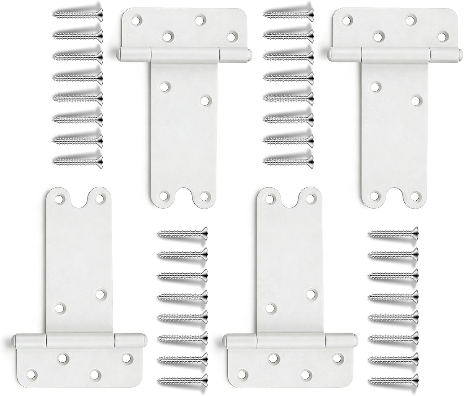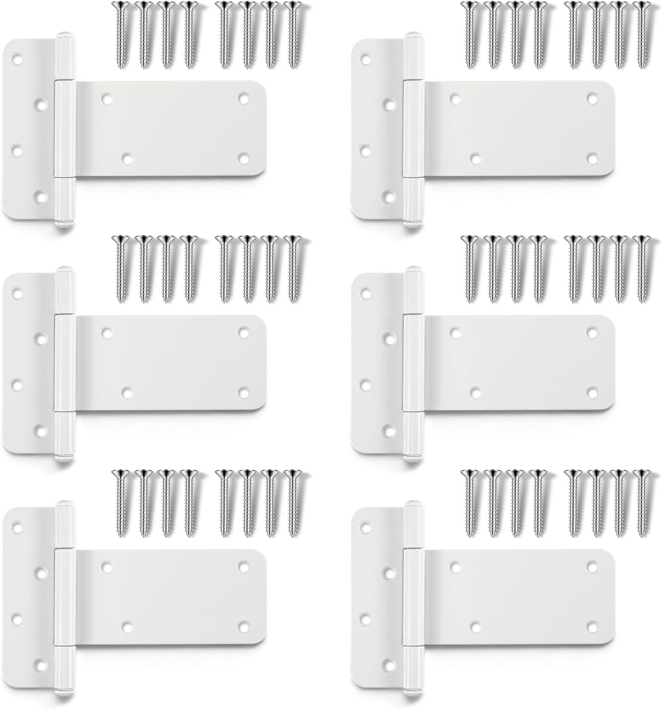 Wmebee T-Strap Shed Door Hinges, Heavy Duty Tee Hinge, T-Gate Hinges, Gate Strap Hinges, Hardware for Wooden Fences, Barn Door, Shed Doors White T-Strap Gate Hinges Heavy Duty Tee Hinge, T-Gate Hinges, Gate Strap Hinges, White Wrought Hardware for Wooden Fences, Barn Door, Shed Doors Wmebee T-Strap Shed Door Hinges, 6 Pack Heavy Duty Tee Hinge, T-Gate Hinges, Gate Strap Hinges, White Wrought Hardware for Wooden Fences, Barn Door, Shed Doors Built for durability and strength, this 6-inch T-Strap hinge is crafted from solid 1.2-inch thick steel, capable of supporting up to 280 lbs. Featuring a corrosion-resistant black matte coating, it's designed for both indoor and outdoor use, making it perfect for barns, fences, farm gates, sheds, decks, and cabinets. The long rectangular design provides superior weight-bearing capacity compared to traditional triangular hinges, and the pre-drilled “pit” holes ensure a secure fit for screws, preventing wood cracking. Easy to install with all necessary screws included.