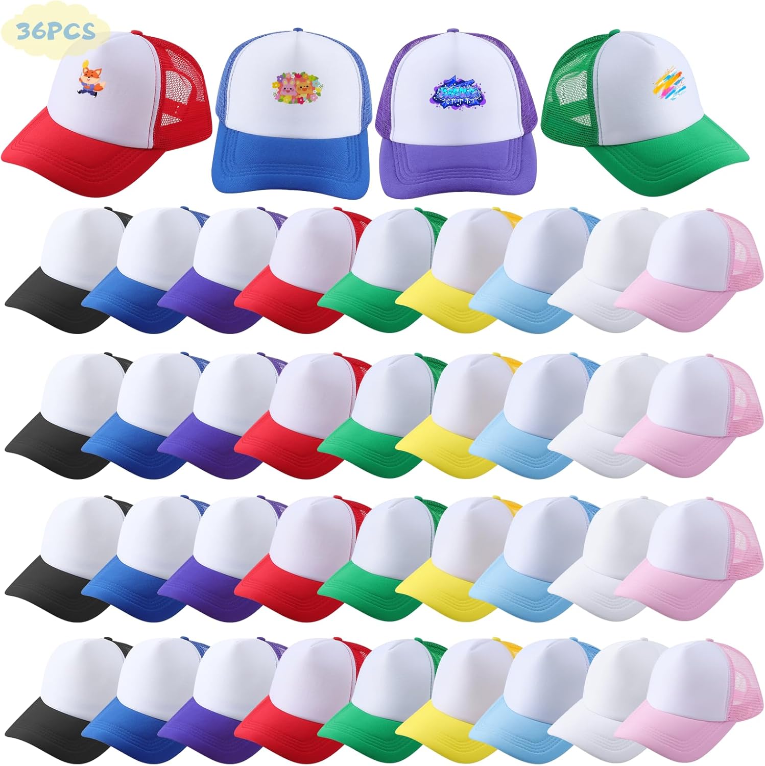 Features: sublimation blank trucker hats in 9 assorted colors. DIY-ready polyester/sponge front panel. Breathable mesh back & adjustable snapbackVersatile applications: Customization for groups/events, daily casual wear, outdoor activities (camping, hiking, festivals).Specifications:Material: Polyester, Sponge, MeshColor: White, Yellow, Light Blue, Purple, Pink, Red, Green, Dark Blue, BlackPackage includes:36 × Blank Trucker Hats (4 of each color)