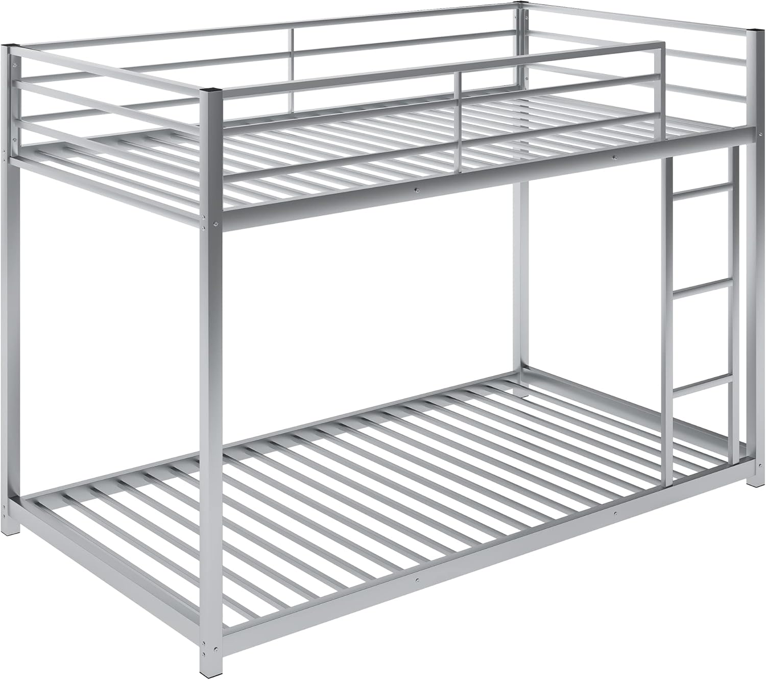 Weight & Dimensions Overall Product Dimension: 78"L x 39.5"W x 65.2"H Detail Product Dimension: Please refer to the Size image Number of Package: 1 Overall Product Weight: 66 LBS Weight Capacity: Upper bed- 220LBS / Bottom bed- 220LBS Recommended Mattress Thickness: Upper bed- 6"/ Bottom bed- 8" Specifications: Product Type: Bunk Bed Size: Twin-Over-Twin Color: Silver Material: Metal Box Spring Required: No Assembly Required: Yes Country of Origin: Vietnam Product Warranty: One year