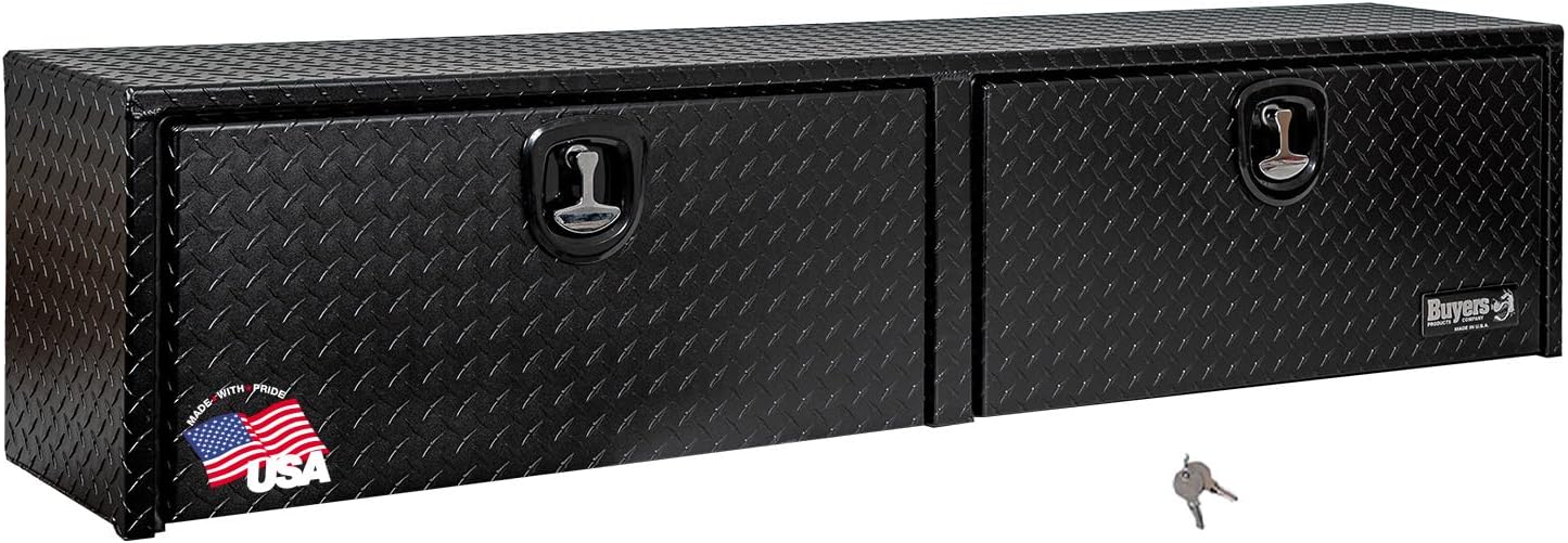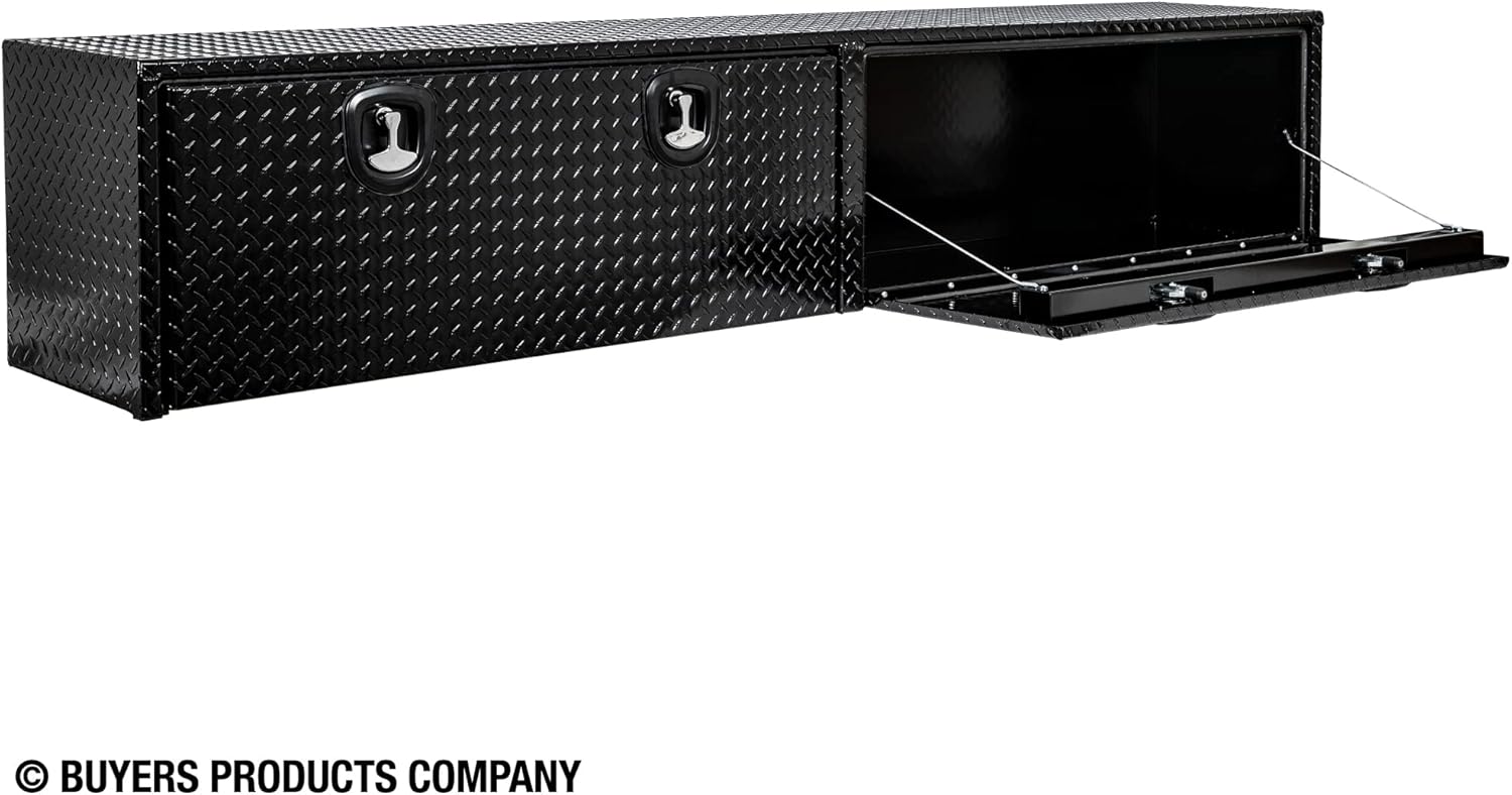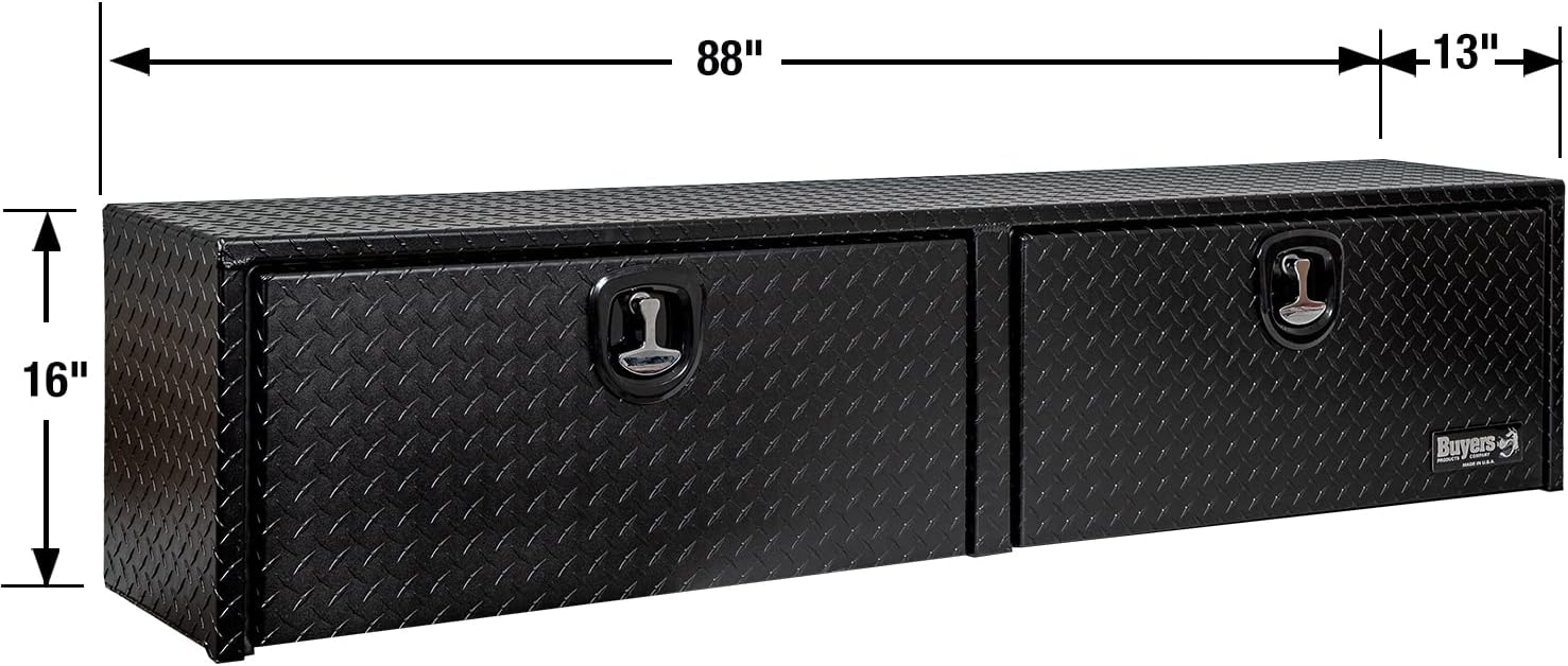 The Buyers Products Gloss Black Diamond Tread Aluminum Topsider Truck Box is designed for hardworking professionals who need reliable, secure storage on the go. This box mounts to your truck bed rails to keep tools within easy reach without sacrificing bed space. Made from corrosion-resistant 0.100 in. thick diamond tread aluminum, it’s built to handle tough jobsite conditions while remaining lightweight. Dual recessed drop doors provide quick access and are reinforced by aircraft-grade support cables. A continuous hidden hinge and weather-resistant seal protect your tools from dust and moisture. Die-cast locking compression latches help deter theft and keep contents secure during travel. The box includes all mounting hardware and offers a no-drill option using J-hooks and protective side-rail pads. Built in the USA, this tool box is a durable, long-lasting solution for contractors, service professionals, and anyone using their truck as a daily work tool.