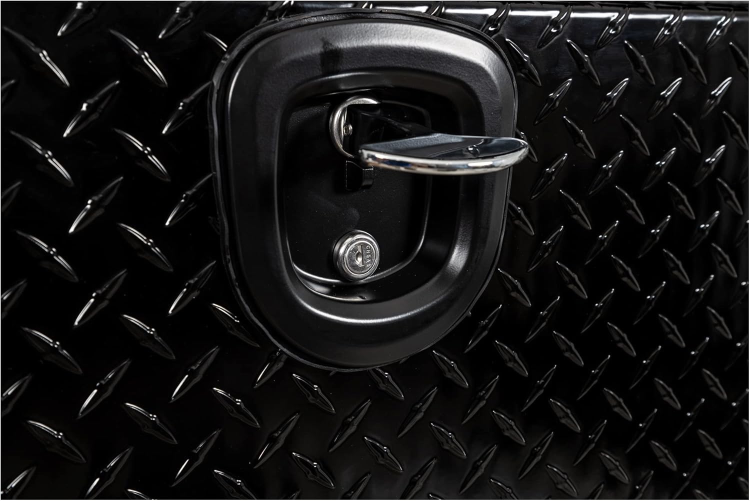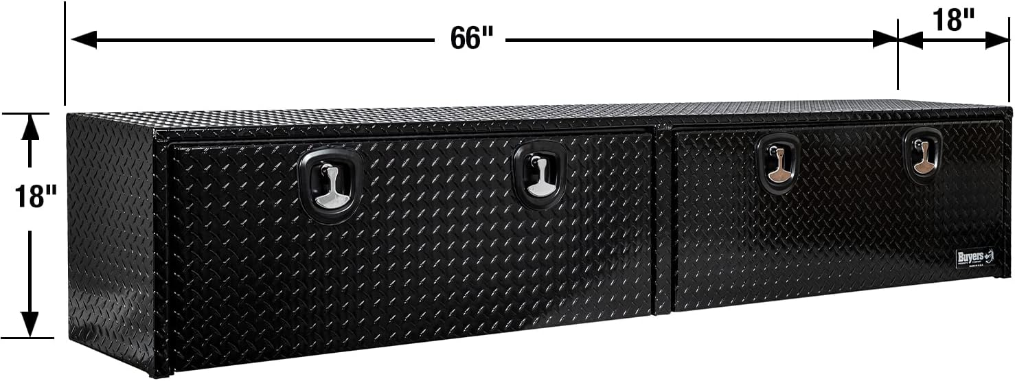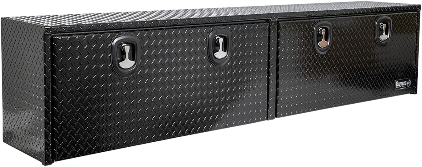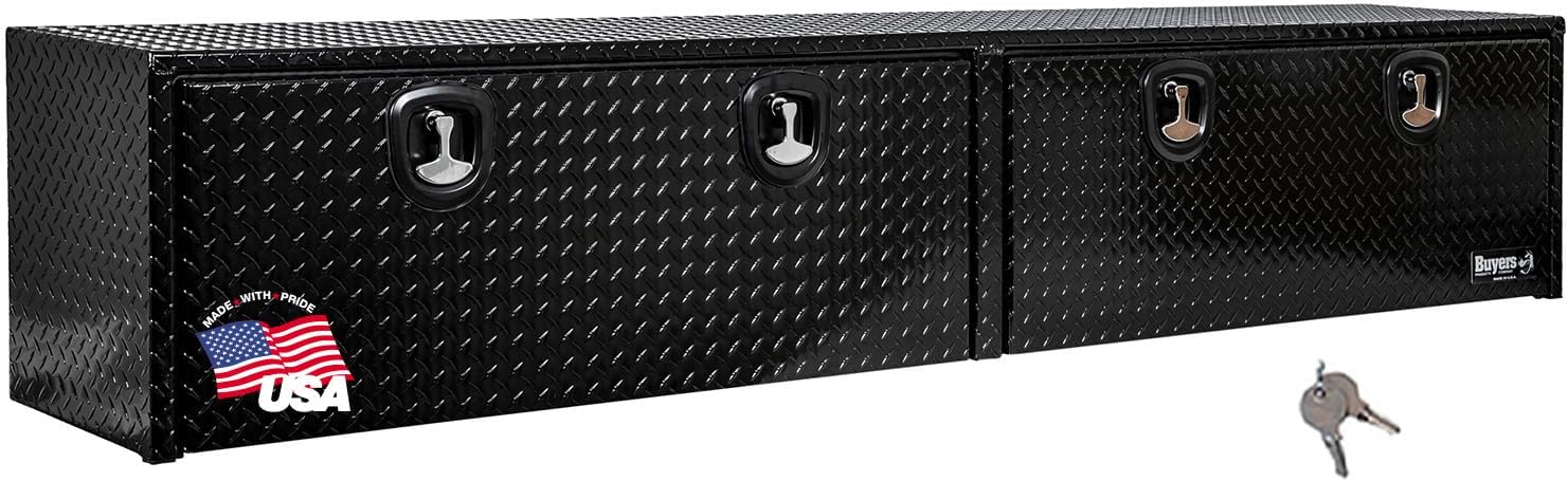 The Buyers Products Gloss Black Diamond Tread Aluminum Topsider Truck Box is designed for hardworking professionals who need reliable, secure storage on the go. This box mounts to your truck bed rails to keep tools within easy reach without sacrificing bed space. Made from corrosion-resistant 0.100 in. thick diamond tread aluminum, it’s built to handle tough jobsite conditions while remaining lightweight. Dual recessed drop doors provide quick access and are reinforced by aircraft-grade support cables. A continuous hidden hinge and weather-resistant seal protect your tools from dust and moisture. Die-cast locking compression latches help deter theft and keep contents secure during travel. The box includes all mounting hardware and offers a no-drill option using J-hooks and protective side-rail pads. Built in the USA, this tool box is a durable, long-lasting solution for contractors, service professionals, and anyone using their truck as a daily work tool.