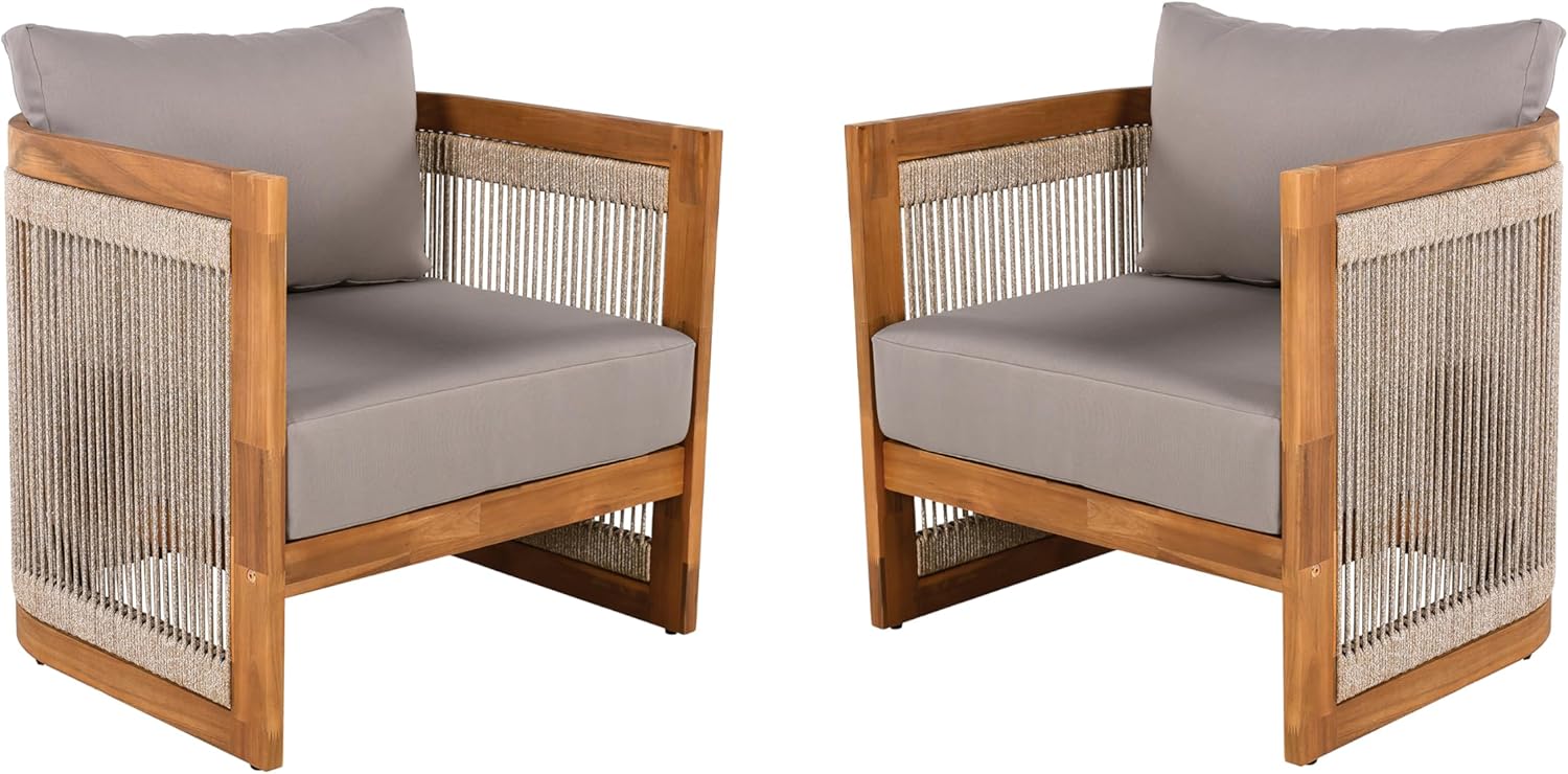 Enjoy refined outdoor living with this 3-piece set, featuring two lounge chairs and one matching coffee table. Crafted from premium acacia wood, each piece offers lasting durability and natural elegance. Handwoven rope accents and slatted details add artisanal charm and breathable comfort. Water-resistant cushions ensure easy maintenance, while the weather-treated finish makes this set ideal for patios, gardens, and poolside relaxation.