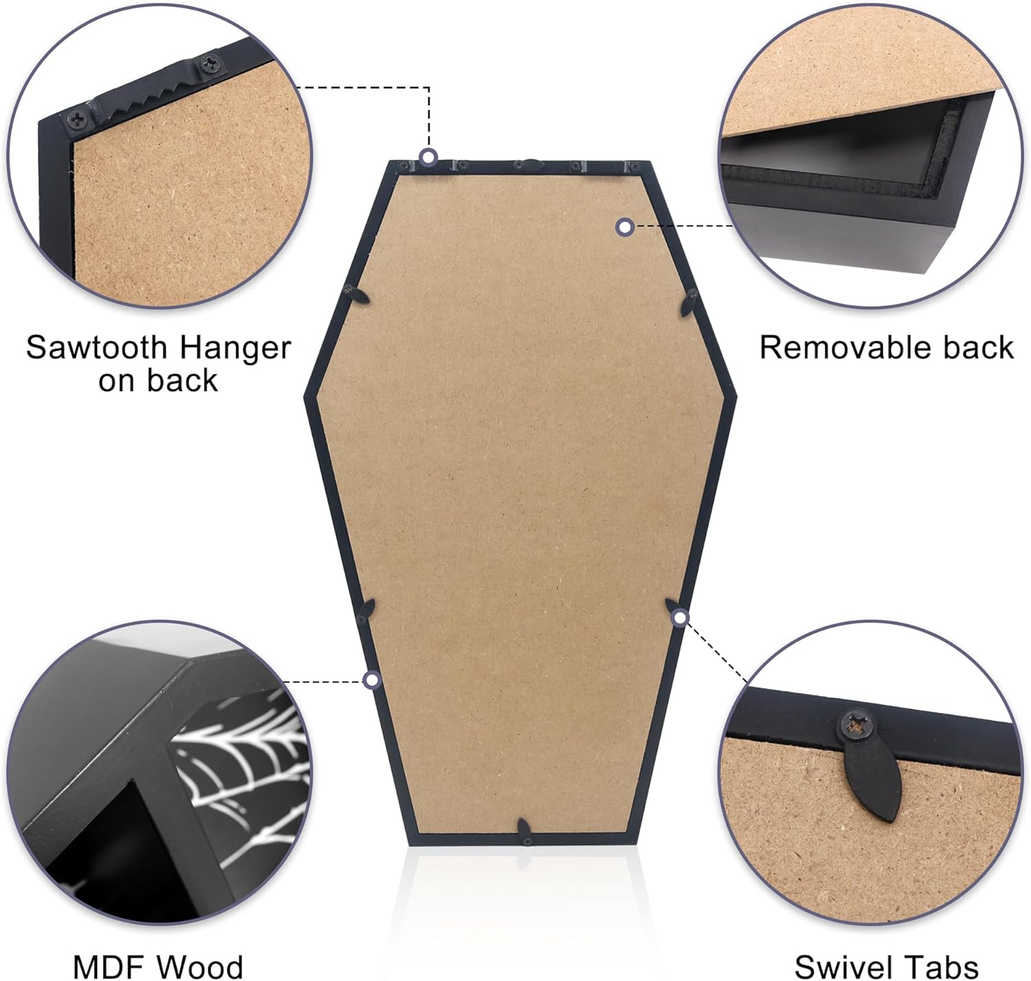 Who needs cute shelves when you are going for the gothic room decor look? Whether you are into horror decor for bedroom or oddities and curiosities, these two coffin shelves will be sure to spook your room guests out! People do all kinds of crazy things in their bedroom these days: gothic furniture, spider decor, witchy bedding, skull candles, or other witchy wall decor. This gothic shelf can hold whatever goth stuff or accents that you might be interested in. If you have small books, it can double as a bookcase. With two coffins you can have more room for decoration.