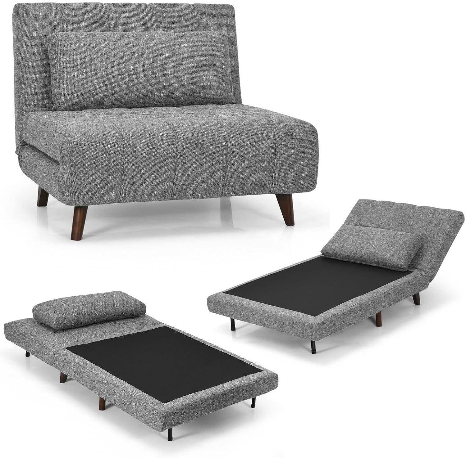 Description:Our sofa bed is a addition to your apartment and office.Thanks to its folding design, you can convert it into a single sofa, a recliner lounger or a single bed. Besides, you can adjust the backrest angle (105°, 135°, 180°)according to your different needs. Breathable cotton linen fabric, high-elastic sponge and S-shaped spring design ensure comfortable sitting and lying experience. Additional pillow can perfectly support your waist. Moreover, solid frame and birch wood legs keep it stable and sturdy. Thus, our sofa bed is able to hold a weight of 440 lbs. Non-slip foot pads and hidden iron legs allow for more stability. Furthermore, with simple and , our sofa bed is a decoration for your living room, bedroom and study. You can freely place it wherever you like.Features: place to read books, play games, watch TV and take a napCan be used as a single sofa, a recliner lounger or a single bed3 adjustable backrest angles (105°, 135° and 180°) to satisfy your different needsBreathable cotton linen fabric, high-density sponge and S-shaped spring for much comfortOverstuffed backrest and padded cushion to support your back, hip and legsExtra pillow to give a support to your waistSolid frame and birch wood legs make it not easy to wobbleAnti-slip food pads to prevent floor scratches and add more sturdinessFolding design makes it suitable for different rooms, such as bedroom, living room, study, etcHidden iron legs for convenient usageSpecifications:Color: Beige/Gray/BlueMaterial: Cotton Linen Fabric + Birch Wood + SpongeProduct Dimension of Sofa: 36” x 40” x 32.5” (L x W x H)Product Dimension of Lounger: 69” x 40” x 27” (L x W x H)Product Dimension of Bed: 75” x 40” x 10.5” (L x W x H)Size of the Pillow: 31” x 13” x 6.5” (L x W x H)Net Weight: 63 lbsWeight Capacity: 440 lbsPackage includes:1 x Sofa Bed1 x Instruction