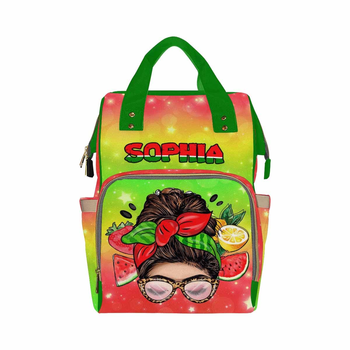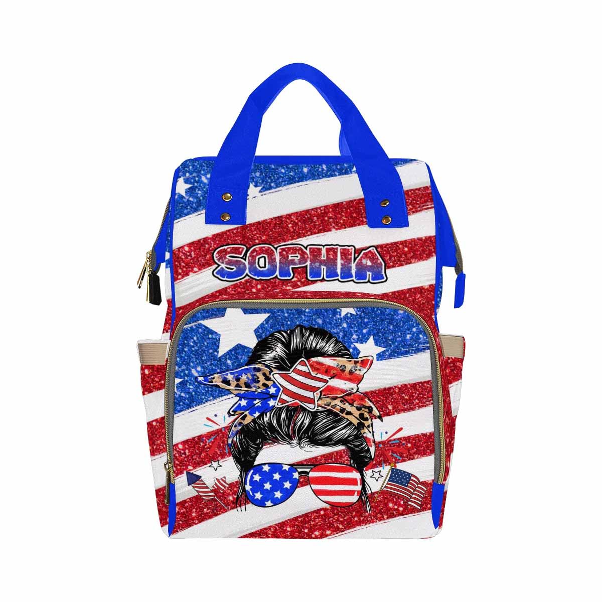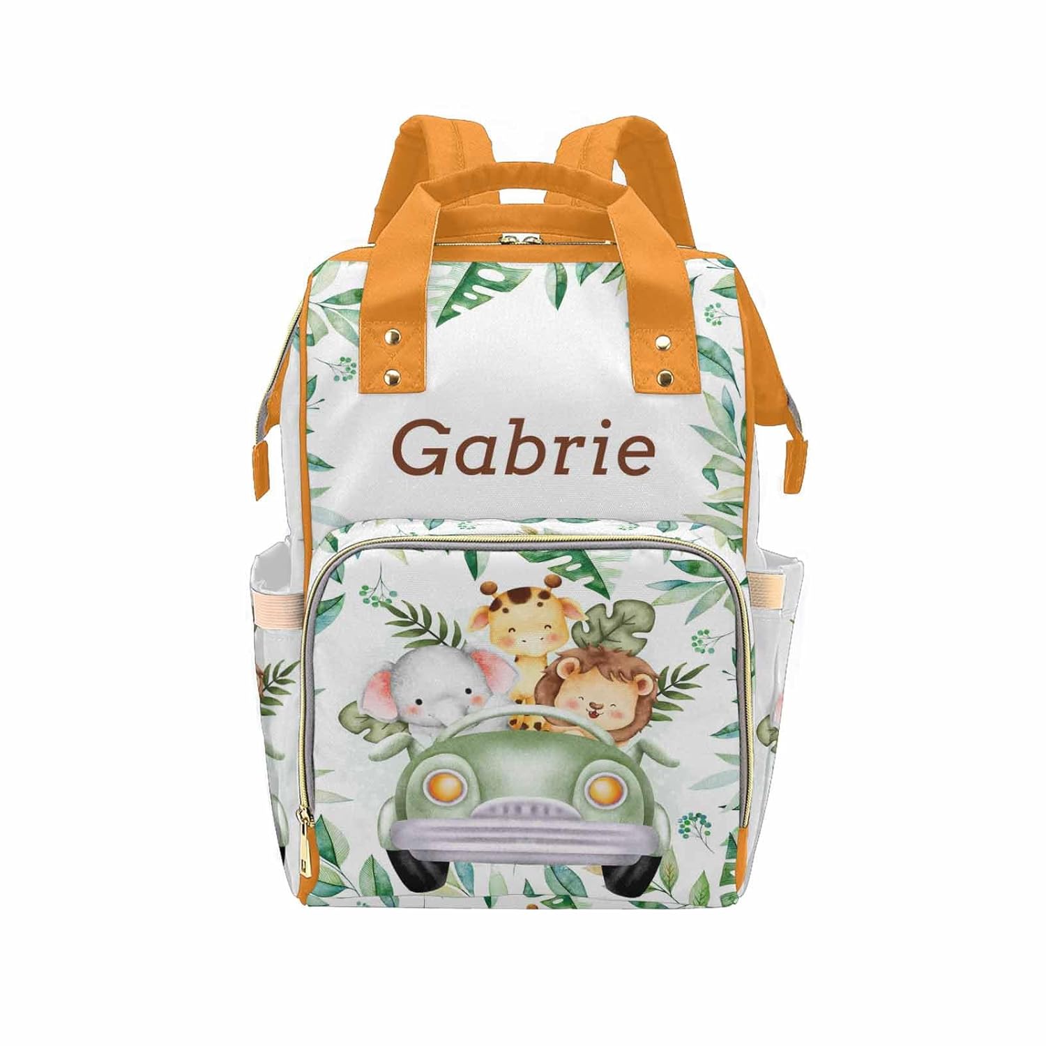 This diaper bag measures approximately 10.83 inches (L) x 6.69 inches (W) x 15 inches (H). The padded back and adjustable shoulder straps bring super comfort and stability.It is a multifunctional backpack with waterproof material, you can put food, clothes, water bottles, diapers, etc. in the pockets. The backpack has an internal main compartment and a number of separate large-capacity pockets to provide plenty of space. The front compartment of the backpack has three separate pockets for bottles, as well as a mesh fabric pocket for snacks, soothers, and some other small items. The backpack also has several separate pockets in the main compartment for diapers, toys, clothing and other items, and a large area in the middle for blankets or some food. The pockets on both sides of the backpack can hold a thermos or pumping paper. This diaper mommy bag is not only multi-functional, but also allows for personal name customization, which is very stylish and unique. Come and customize a diaper mommy bag just for you!