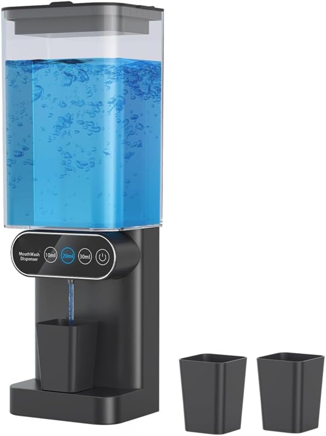 Welcome to my store, Hope you have a pleasant shopping trip! Features:1. Magnetic cup design: This smart induction mouthwash machine is equipped with a magnetic cup, which can be hung upside down at the bottom of the device to effectively drain water and keep the cup dry.2. Large capacity and 3 adjustable gears: built-in 700ml large-capacity liquid storage tank, the touch screen button operation is simple and intuitive, and the three gears are adjustable (10ml/20ml/30ml) to meet the personalized needs of different users.3. Multiple ways of use: The mouthwash machine can be placed on the desktop for use, and it also comes with a self-adhesive hook, which supports wall mounting, especially suitable for places with limited space such as bathrooms and kitchens. There is a storage box on the top, which can be used to place small tools such as wire crimpers and dental flossSpecifications:Color: black, whiteSize: 98*75*289mmWeight: 512gPower supply: 3*AAA dry batteries (not included in delivery)Working gear: three gears (10ml, 20ml, 30ml)Water tank capacity: 700mlMaterial: ABS+electronic componentsPackage List:1 x Automatic Mouthwash Dispenser2 PCS x Magnetic CupNotes:1.Due to the difference between different monitors,the picture may not reflect the actual color of the item.We that is the same as shown in the pictures.2.Please allow 1-2cm slight dimension difference due to different manual measurement.