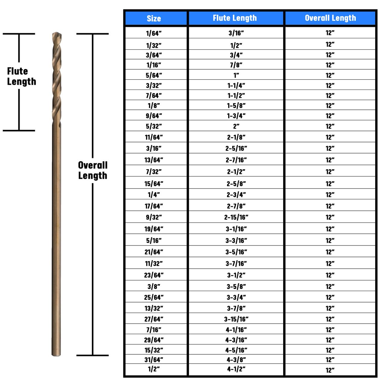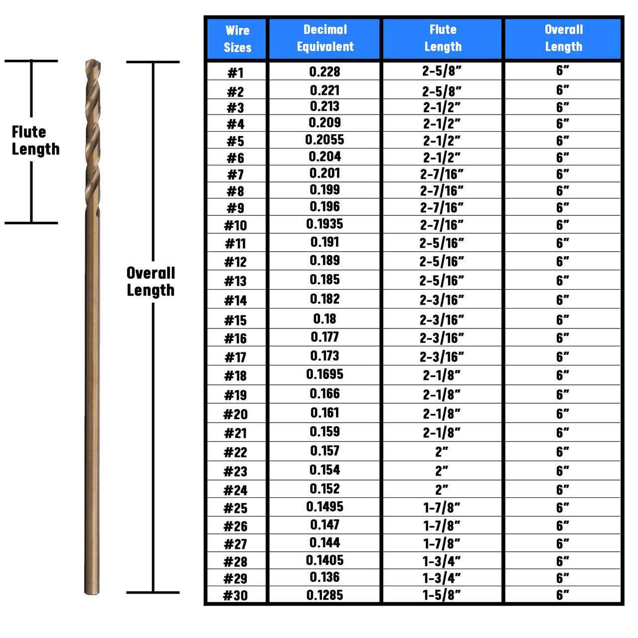 Drill America Cobalt Aircraft Extension Drills are similar to high-speed steel, but with more cobalt for improved performance when cutting harder metals such as stainless steel or nickel alloys. Gold oxide is a thinner oxide surface treatment than black oxide typically used to identify cobalt steel tools; performance is similar to uncoated tools. Drill America Aircraft Extension Drills are manufactured to National Aerospace Standard 907. The 135° split point is self-centering and reduces thrust. Sizes smaller than 1/16 in. have the 118° standard point. Drill America Aircraft Extension Drills are available in 6 in. and 12 in. overall lengths when extra reach is required.