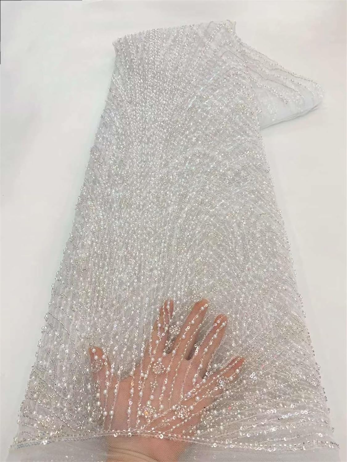 Introducing our Exquisite Handmade Beads Sequins Tulle Lace Fabric for Wedding Dress Sewing! This fabric showcases a stunning fusion of shimmering sequins and beads intricately woven into the delicate tulle lace, making it an impeccable choice for brides who aspire to radiate elegance on their momentous day. Crafted from premium materials, this fabric ensures durability and utmost comfort when worn. With a generous length of 5 yards, you will have ample material to bring your dream dress to life. The fabric exudes sophistication and grace, rendering it suitable for various types of dresses including wedding gowns, evening attire, prom dresses, and more. Each step you take will be adorned with the resplendent glow emanating from these luminous tulle laces. This sequin and bead fabric is guaranteed to make you the focal point with its captivating and dazzling appearance. It is perfect for those seeking to make a bold fashion statement while standing out in any crowd. Wearing this fabric will instill confidence within you as well as attract numerous admiring gazes.