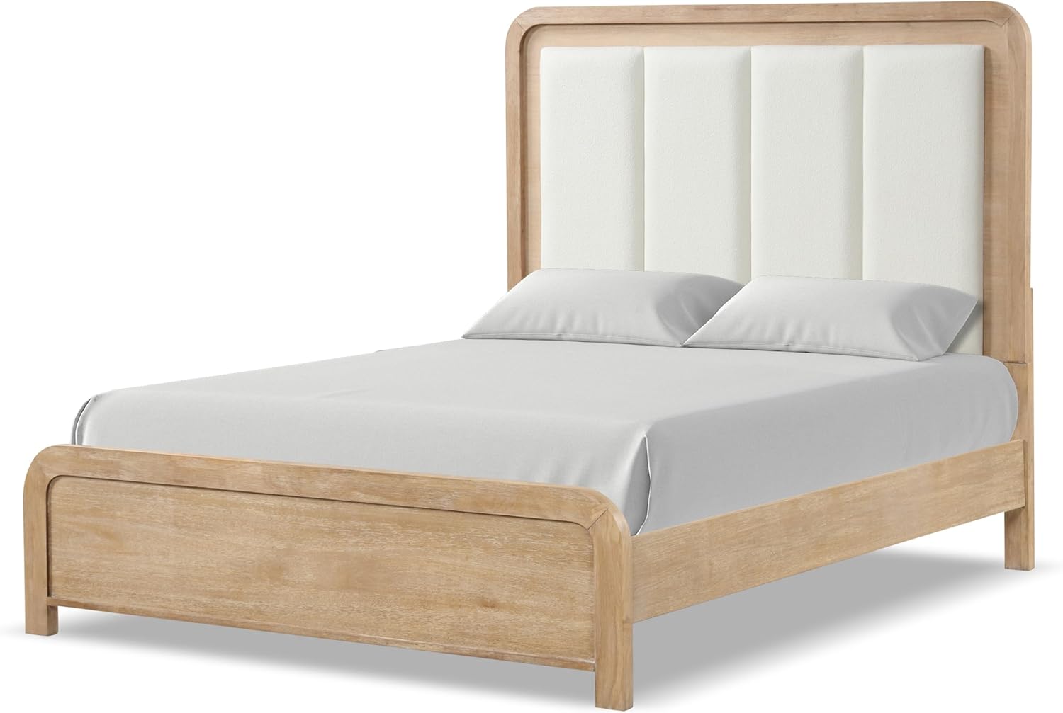 Luxurious Comfort in a Minimalist Bed This king size bedframe features a channel-padded headboard, offering ultimate comfort for relaxation and reading.Crafted from solid rubberwood, mango wood, and metal, it showcases a durable and sturdy solid wood framework.The curved headboard and footboard are upholstered in soft fabric, adding a modern touch to its minimalist design.The two-tone finish enhances its visual appeal, while the elevated design allows for easy cleaning underneath.A box spring is required for use, making this modern king size bed frame both practical and stylish.A Stylish Focal Point for Your Bedroom Designed to blend with various decor styles, this wooden king size bed frame provides both comfort and visual appeal with its padded headboard and minimalist structure.The elevated design ensures ease of maintenance, while the curved design of the headboard and footboard adds a sense of elegance.Perfect for cozy bedrooms or larger spaces, this wood king size bed frame creates a warm, inviting focal point in any room.Its blend of materials and sturdy construction ensure long-lasting durability, making it an ideal choice for both comfort and style.