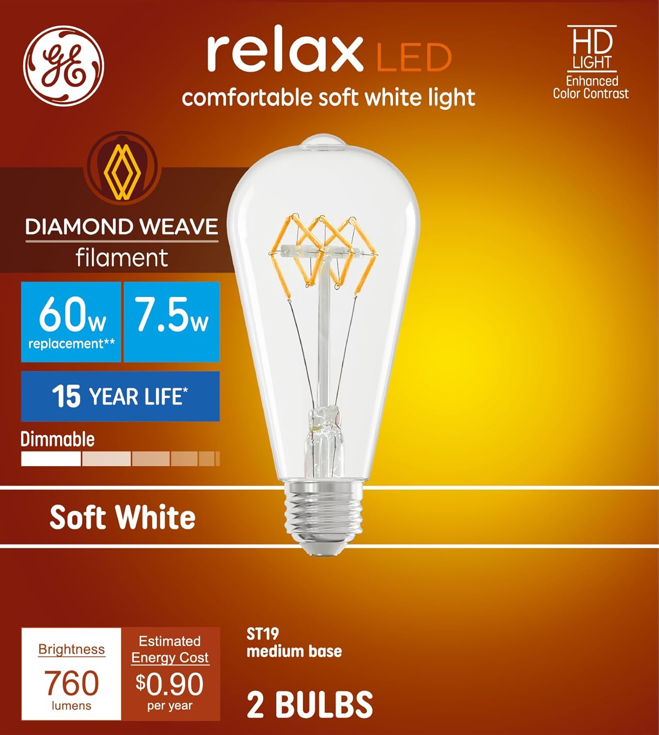 GE Relax HD Soft White LED 40-Watt Replacement G25 Globe decorative light bulbs provide enhanced color contrast and boldness versus standard LED bulbs. The high-definition soft white light helps create a comfortable, cozy light that's ideal for bedroom lighting, foyer lighting, family rooms, and dining rooms. Featuring a clear finish and medium base, they're dimmable and illuminate your home with soft white light. Great for frequently used fixtures, this GE Relax HD Soft White LED bulb is rated to last 13 years and save 59 on energy costs over the bulb's life versus a 40-watt incandescent bulb. Unlike CFL bulbs, GE LED HD bulbs feature enhanced color, instant full brightness, and are free of mercury. Replace CFL and incandescent light bulbs with GE Relax HD Soft White LED G25 Globe bulbs (3-1/8-inch diameter) in dimmable indoor bathroom vanity lights, makeup mirrors, and pendant lighting (including damp locations).