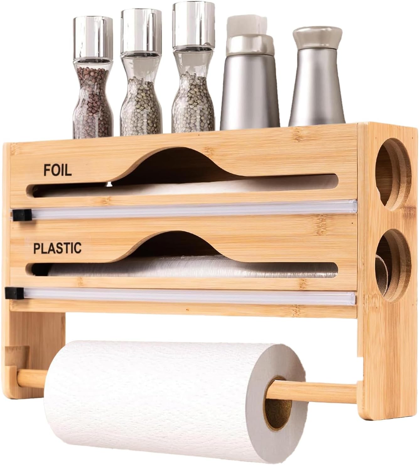 A practical, wall-mounted aluminum dispenser, equipped with a cutter box designed to optimize kitchen organization; perfect for distributing aluminum rolls and paper effortlessly in the daily routine; Maintains your pantry or cabinet and is suitable for both home and commercial use, including barbecue activities and storage. Specification: Product Material: Quality Wood Product size: about 35.5x21x7cm/13.86x8.27x2.76 inches, perfect for rolls up to 12 inches long Product weight: 986 g Product List: Aluminium dispenser with cutter*1 Note: Due to different lighting and screen settings, the colour of the item may be slightly different from the picture. Due to different manual measurements, please allow 1-2 cm size difference.