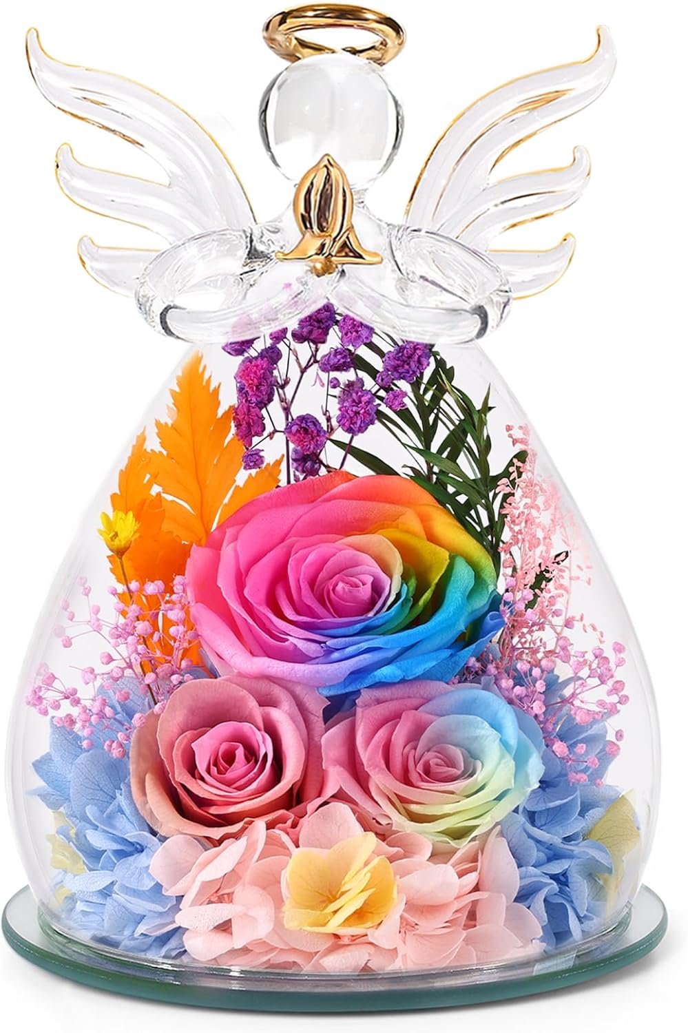 angel figurines, austinia, baby's Breath, eternal flowers, eternal rose, eucalyptus, forever flowers, fresh flowers, glass, hydrangea, led string light, pampas grass, preserved flowers, rose |