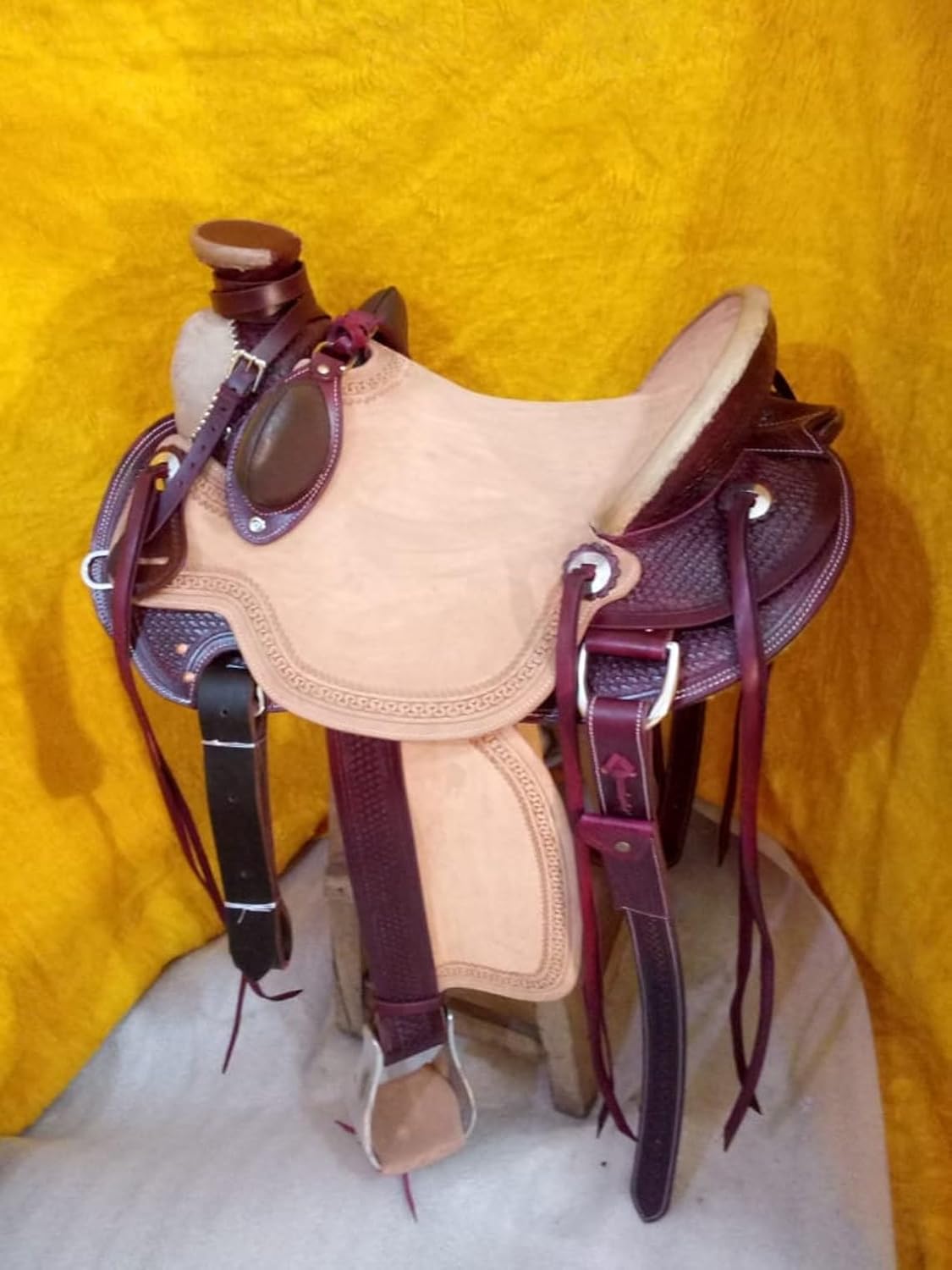 Saddles are an essential piece of equipment for any equestrian, providing the crucial connection between rider and horse. Crafted with care and precision, a high-quality saddle offers comfort, support, and control for both the rider and the animal. Whether you're a seasoned competitor or a casual trail rider, finding the right saddle can make all the difference in your riding experience. With a wide range of styles and materials available, from classic English to rugged Western designs, there's a saddle to suit every discipline and preference. Invest in a well-made saddle, and you'll enjoy countless hours of enjoyable and secure riding adventures. *** Girth Cinch, Back Cinch, Saddle Pad, and Horse Bit NOT INCLUDED *** Our top selling leather colors are now available in this beautiful A-Fork wade tree roper! This wade tree roping saddle features a hand carved tooling that is designed on thick cowhide leather. The seat offers the perfect grip while roping cattle. The classic design of the saddle features shiny silver conchs and numerous ties for accessory attachments. . The wide pie horn is reinforced with a mule hide wrapping for extra stability and durability. The underside of the saddle is well-padded with fleece for maximum horse comfort. 100% Heavy Duty Cowhide Leather Hand Carved Tooling Seat Mule Hide Wrapped Horn Numerous Accessory Ties Shiny Silver Sun Conchs Adjustable Stirrups Adjustable Blevins Buckles Well-Padded Fleece Underside Wade Tree Design Wood Base Tree Wrapped In Fiberglass. If You require Wooden Tree Saddle in the same Model Kindly Drop a message. Saddle Specifications:- Color: As Per Picture. Pony Saddle Measurements:- Seat Size: 10 to 12 inches. Gullet: 5" FQHB . Skirt: 23 – 26” Horn: 2” x 5” wide. Horn: According to Picture. Swell: 6” Cantle: 3” Stirrups: 25 – 35 Weight: Approx. 24 lbs. Adult Saddle Measurements:- Seat: 14" to 18" inches Seat. Gullet: 7" FQHB . Skirt: 25 – 29” . Horn: 3” x 5” wide . Horn: According to Picture. Swell: 8” . Cantle: 4”. Stirrups: 28 – 38”. Weight: Approx. 28 lbs