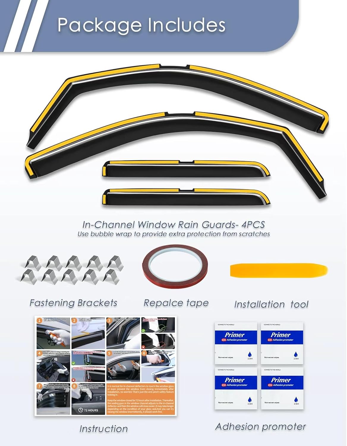 1. Compatibility & Fitment ✔ Fits: Jeep Compass 2017 2018 2019 2020 2021 2022 2023 2024 2025 2026 ⚠ Does NOT fit: Jeep Compass 2011 2012 2013 2014 2015 2016 2017 Please double-check your truck’s model and compare it with our product images before purchasing. If you’re unsure whether these rain guards will fit, feel free to message us—we’ll confirm for you! --- 2. Premium Polycarbonate (PC) Construction Our vent visors are made from long-lasting shatterproof Polycarbonate (PC) material—stronger and more durable than standard materials. They’re built to last, resisting cracks and damage even in tough conditions. Rest easy knowing you’re getting a top-quality product. --- 3. Sleek, Fade-Resistant Finish Each rain guard undergoes a 4-step baked-on paint process, giving it a glossy, long-lasting finish that won’t fade over time. Not only do they protect your windows, but they also add a sharp, custom look to your truck. --- 4.Easy Installation Guide 1️⃣ Test Fit – Check alignment of front & rear pieces before installing. 2️⃣ Prep Surface – Clean window channels thoroughly (alcohol wipes work best). 3️⃣ Boost Adhesion – Apply the included adhesion promoter for a stronger hold. 4️⃣Temporary Tape – Peel back a few inches of tape paper to align before final placement. 5️⃣ Insert Visors – Flex them gently into place—durable yet easy to adjust. 6️⃣ Secure & Seal – Tear off the remaining tape paper,Press firmly, then close windows incrementally gently push the rain guard outward at the same time to lock in position. 7️⃣ Set & Dry – Avoid opening windows and washing for 72 hours for maximum bond strength. Pro Tip: Works best in temperatures above 60°F (15°C)