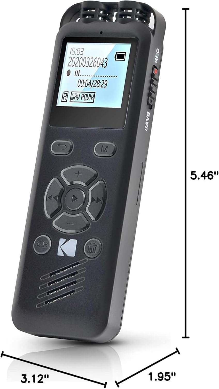 The KODAK VRC250 is a compact and powerful voice recorder specially designed to record your notes, meetings, interviews or ideas clearly and accurately. Thanks to the intelligent voice control, the device automatically starts recording as soon as it detects a sound, leaving you hands free and not missing any important information. Equipped with a rechargeable lithium battery, it provides long battery life that is ideal for longer recording sessions without interruption. Its MP3 player feature allows you to play your audio files directly on the device, providing an all-in-one solution for your recording and playback needs. Lightweight and discreet, the KODAK VRC250 is easy to carry, making it an ideal choice for everyday use, whether for professional use on the go or for home use. Its simple and effective design makes it a practical and reliable audio recording tool for any situation.