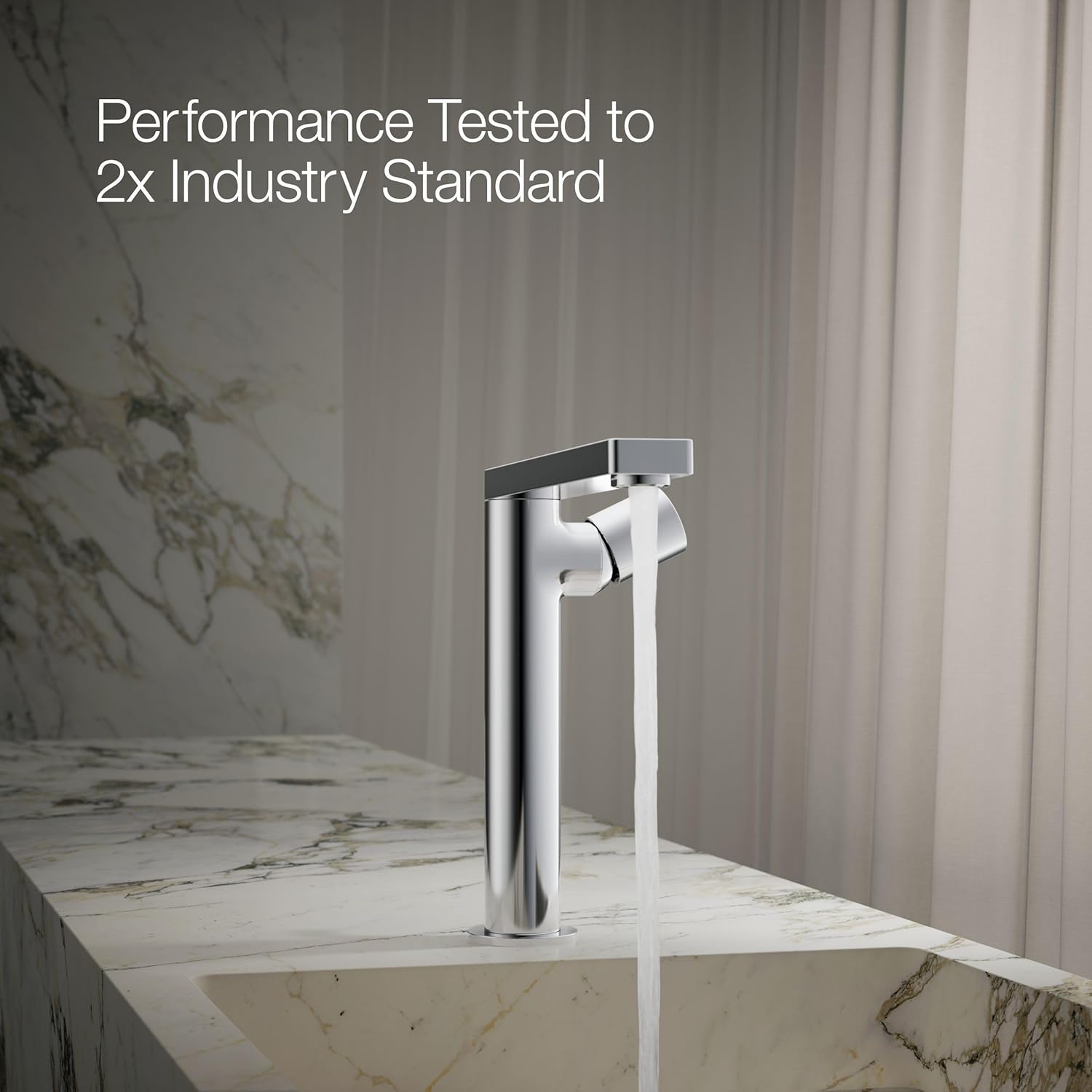 Timeless and deliberate, the KOHLER Composed collection embodies the beautifully understated elements of minimalist design. By eliminating unnecessary details, the collection is designed to elicit an emotional response with its stark, refined beauty. This tall single-handle bathroom sink faucet is a striking complement to vessel sinks.