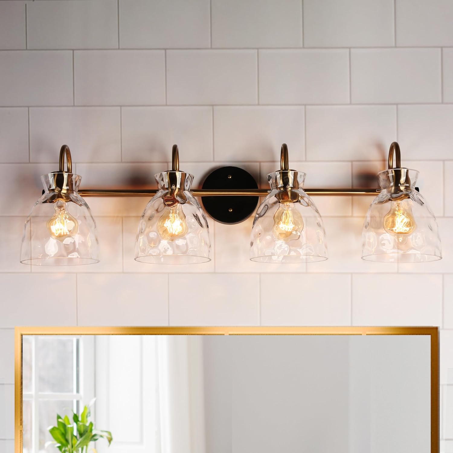 This bathroom vanity light features an elegant combination of black and electroplated brass, creating a sleek and sophisticated look. The black brass vanity light is designed with two arching arms that gracefully hold the water ripple glass shades, giving it a unique textured finish. The textured glass shades allow the light to shine through, while the arching brass arms add a touch of industrial charm.
