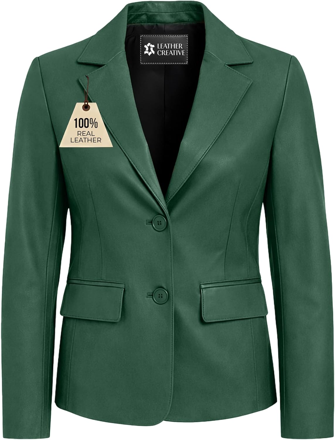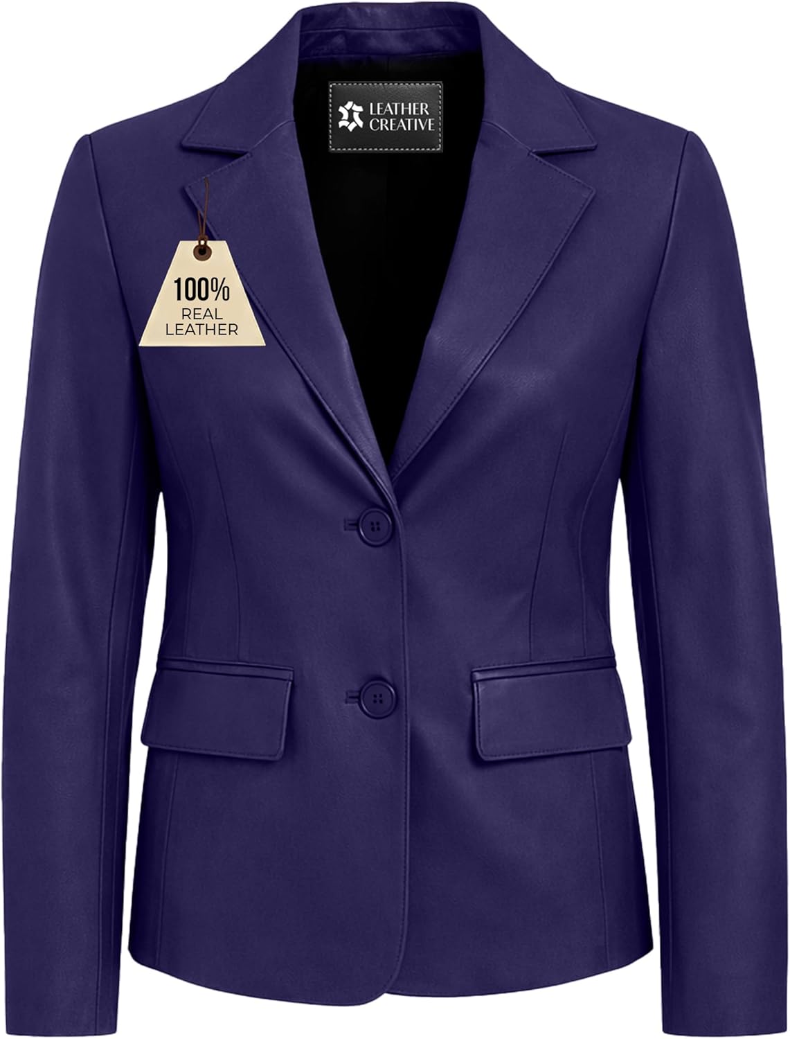 Our Classic 2-Button Lambskin Leather Blazer is the perfect addition to your wardrobe, combining timeless style with unmatched comfort. Our real leather jacket women made from 100% genuine lambskin leather, these soft, durable women's leather jackets features a classic notched lapel, long sleeves, and functional flap pockets. Whether you're dressing up for work or adding a polished touch to casual outfits, this genuine leather jacket layers effortlessly over blouses, dresses, or tees. We create quality, finely-crafted blazers that make you look and feel amazing, season after season.