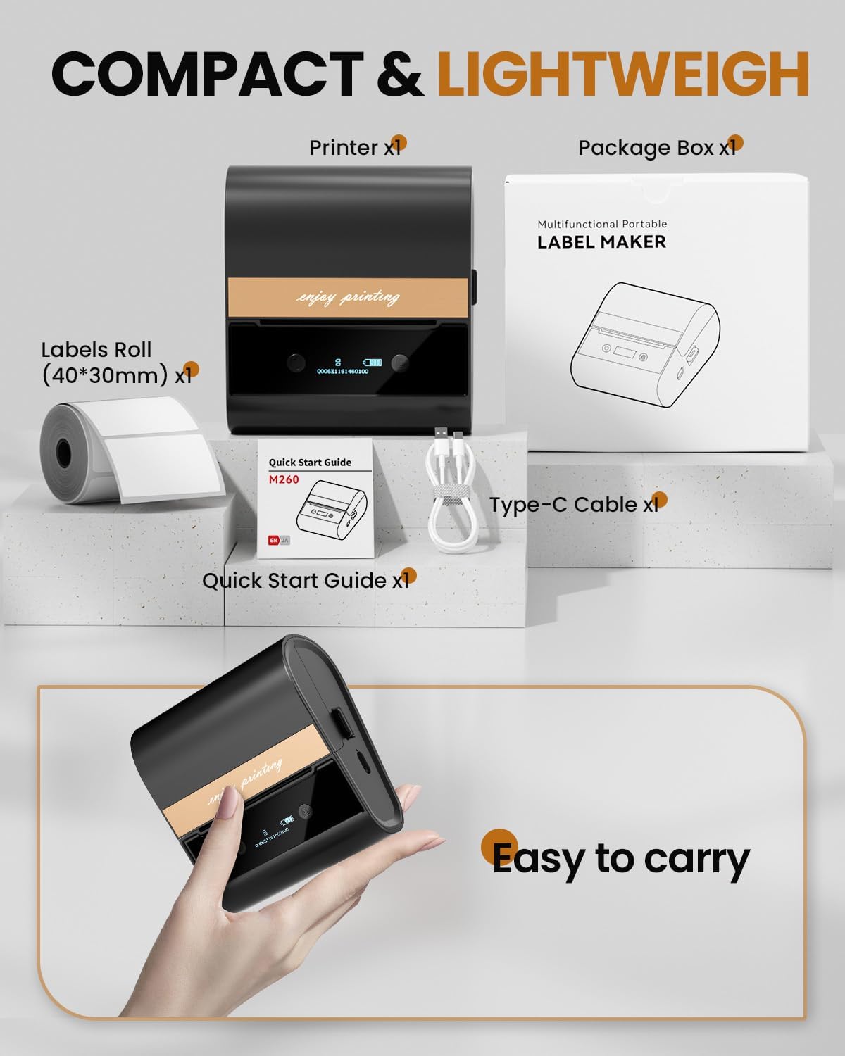 BuiltIn Media 40*30 mm Paper Roll x 1, Portable Label Maker x 1, Quick start Guide x 1, Type-c cable x 1