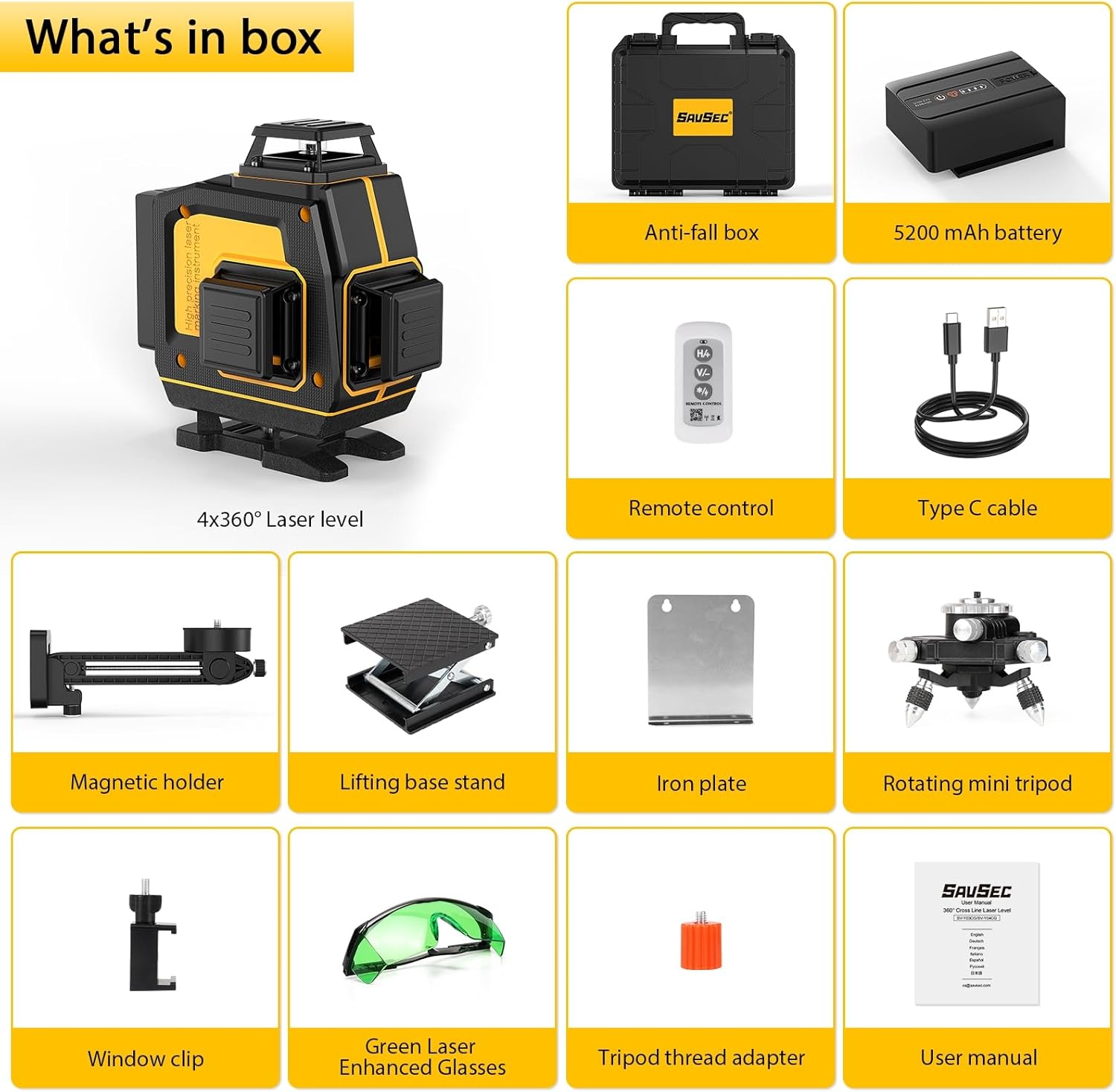 | Included Components | 1 x SV-Y04CG laser level, 1x magnetic wall brakect; 1x iron plate; 1x lifting platform; 1x 360° ratoting mini tripod; 1x window clip; 1x threaded conversion adapter, 1 x Green Laser Enhancement Glasses, 1 x Type-C Power Cord, 1 x 5200mAh Li-ion Battery, 1 x Hard Carrying Case, 1 x Product Manual. |
