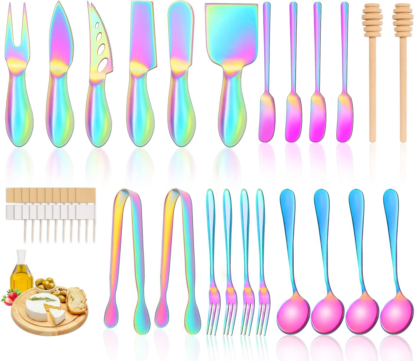 | Included Components | Shovel, Flat Knife, Tooth Knife, Sharp Knife, Round Knife, Fork Knife, 4 Spreading Knives, 4 Mini Forks, 4 Small Spoons, 2 Little Tongs, 2 Wooden Honey Dippers, 20 Blank Flags Cheese Markers(10 White, 10 Kraft) |