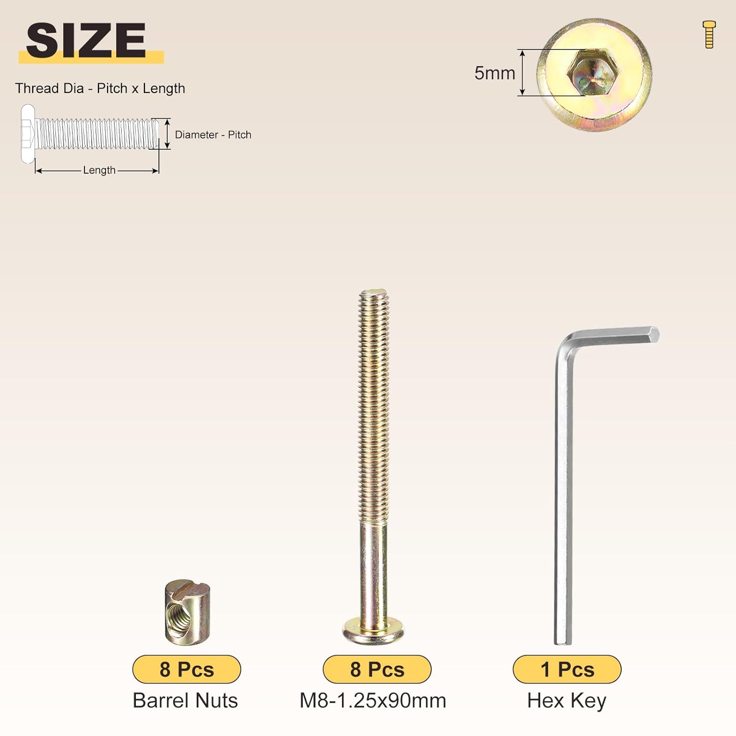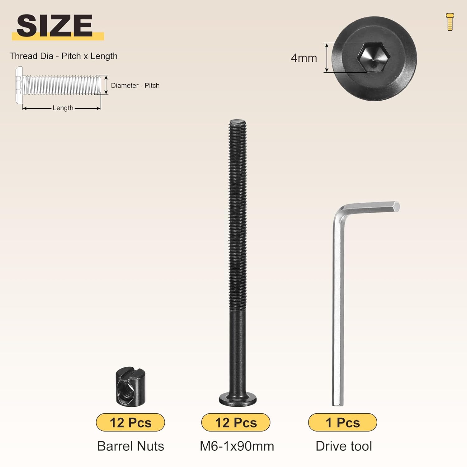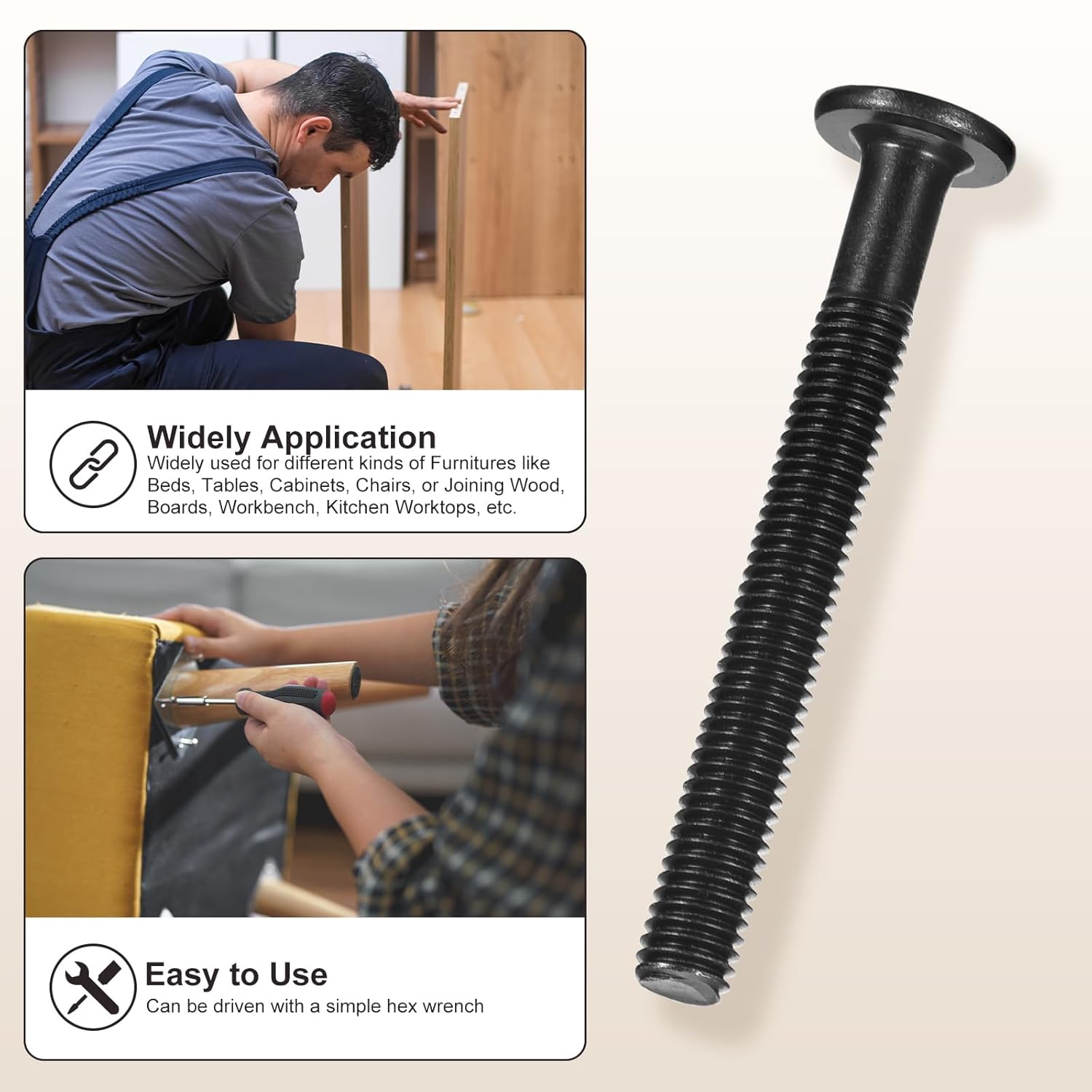 APPLY TO - Barrel nuts and flat head screws with wrench used for assembly, connecting various components like screws, nuts, and bolts. They ensure stability by connecting furniture frames, supports, and structures.SPECIFICATION:Product Name: Barrel Nuts and Flat Head Screws with WrenchFlat Head Screws Thread Diameter: M6-1(Thread Dia x Pitch)Flat Head Screws Screw Length (mm):40Applicable Hole Size: 8mmColor: SilverMaterial: Carbon SteelQUANTITY INCLUDED - 100Pcs x Flat head socket cap screw - 100Pcs x Barrel Nuts - 2Pcs x Drive toolADVANTAGE - Furniture Joint Connector Bolt & Cap Nut Kit in Different Extreme Environments; including furniture assemblies like beds, tables, cabinets, and chairs; woodworking projects involving joining wood, boards, workbenches, and kitchen countertops; as well as office appliances, 3D printing, bicycles, Photo Album, Leather, Crafting, etc.INSTALLATION -Insert the screw into the hole on one end and insert the nuts to cover the screw on the other end. Lastly, use the wrench to tighten the bolts nuts.DESIGN - Choose Carbon Steel Fasteners for: Flat head Hexagonal socket head type, uniform force that is not easy to slip, easy to use by normal hex keys, T-shaped hex keys, and electric screwdrivers. Suitable for replacing old bolts at any time.Barrel Nuts and Flat Head Screws with Wrench Note - Before making a purchase, please confirm the correct size needed. Using a caliper for measurement is recommended, and try to avoid using a ruler or tape measure.