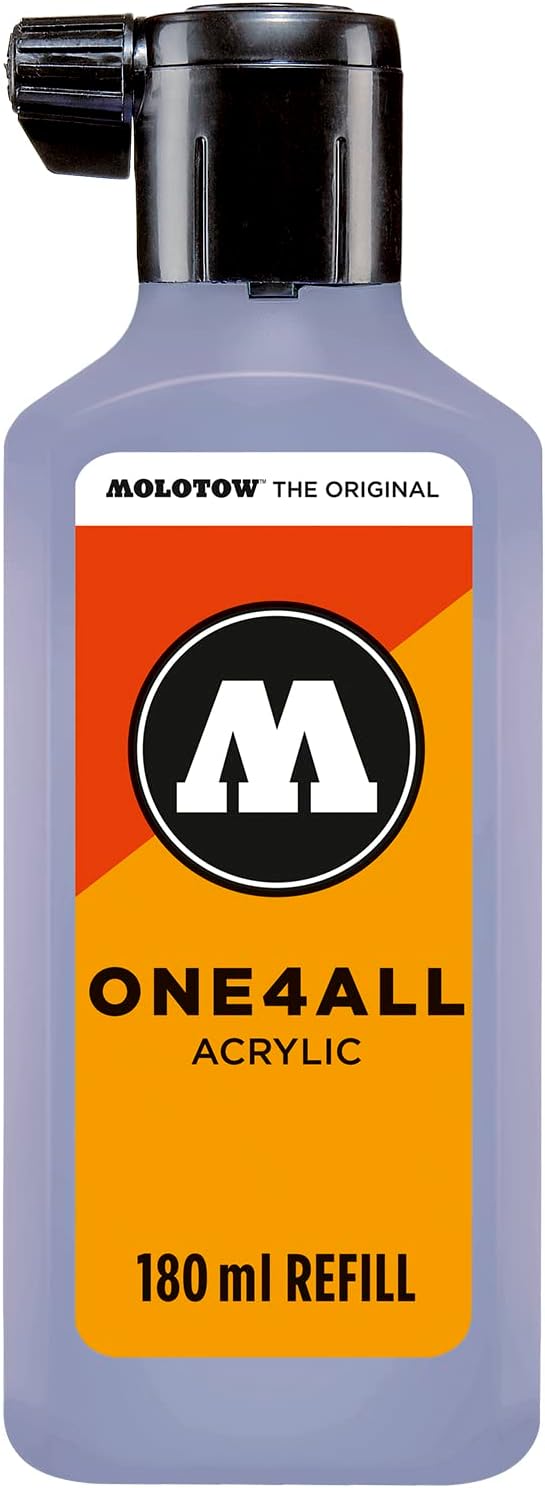 Molotow ONE4ALL Acrylic Paint Refill, Signal White, 180ml Bottle is acrylic paint to refill any sized Molotow ONE4ALL paint marker - 1mm, 1.5mm, 2mm, 4mm or 15mm. The dispenser cap ensures an exact and clean dosing of paint. Mix colors together to create your own unique hue. This acrylic-based hybrid paint is UV and weather-resistant for highest opacity. It is solvent-free and dilutable with water or acetone. Made in Germany.