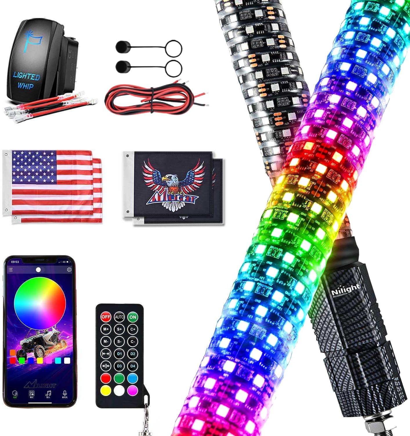 | Included Components | 2 X 3FT Whip Light, 1 X 8.61FT Controller Box Wire Kit, 1 X 6.56FT Extension Cord, 1 X Remote Control, 1 X Rocker Switch & Jumper Wires, 1 X User Manual, 2 X Flags, 1 X Dust Cover, 2 X Zip Ties |