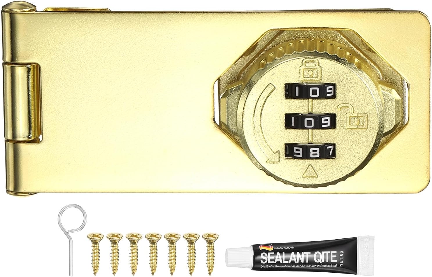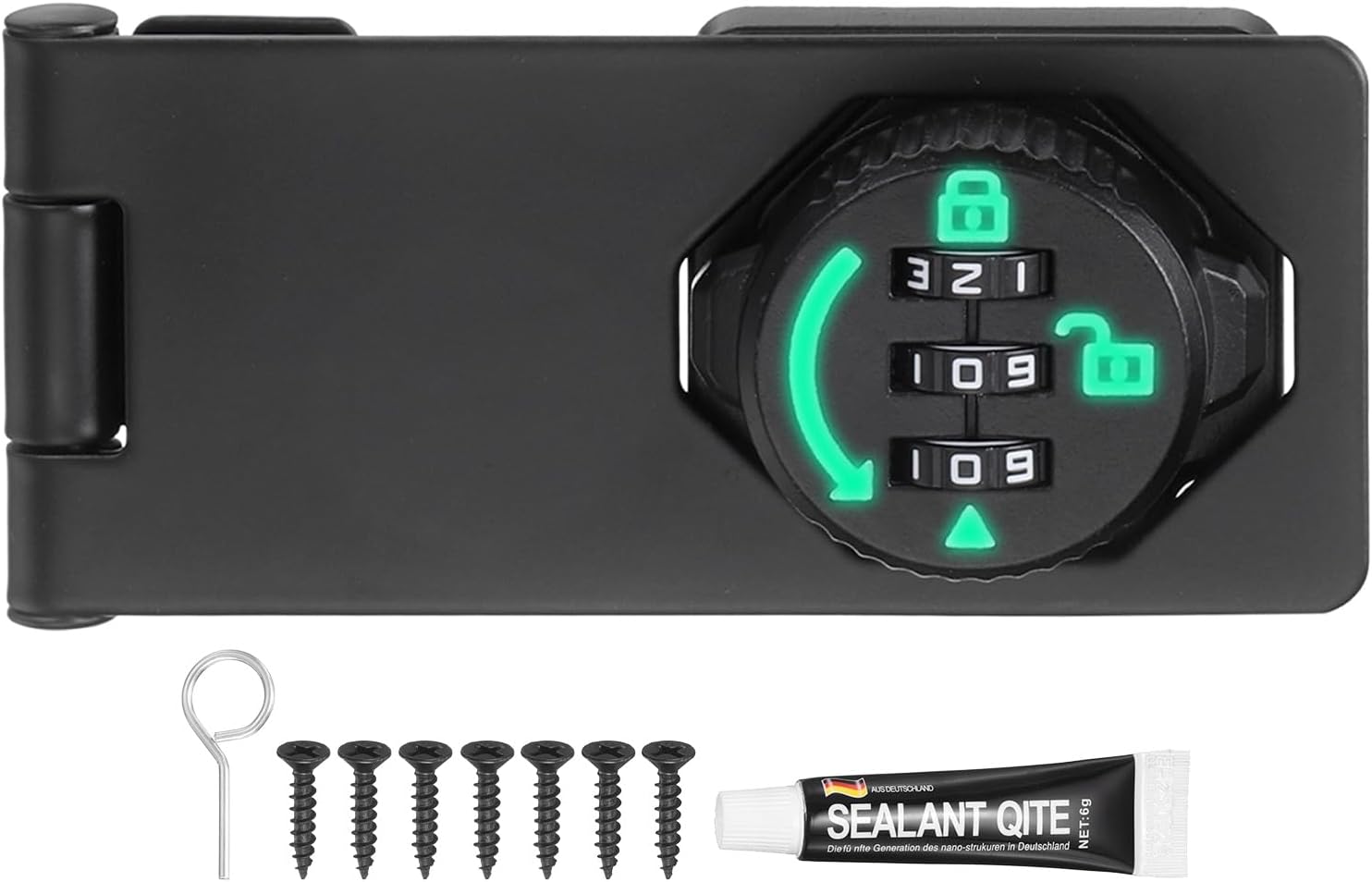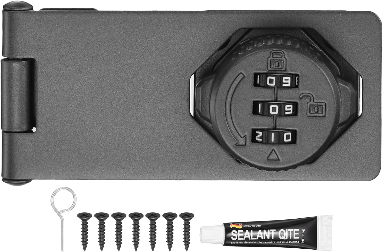 Reasons for Selection - This keyless combination lock is crafted from zinc alloy and alloy steel, with a rust-resistant multi-layer electroplated surface for long use. Its thickened, reinforced structure resists forced entry, while the keyless design ensures anti-theft protection and convenience.Measurement - Material: Zinc Alloy, Alloy Steel; Color: Silver; Total Length: 115 mm / 4.53 inches; Long Buckle Plate Length: 96 mm / 3.78 inches; Short Buckle Plate Hole Diameter: 4.7 mm / 0.19 inches; Width: 44 mm / 1.73 inches; Knob Diameter: 33 mm / 1.30 inches; Lock Head Height: 28 mm / 1.10 inches; Package Includes: 1 PCS x Password Rotary Hasp Locks (7 Screws + 1 Tube of Glue + 1 Password Reset Pin).Suitable for - This keyless combination lock is suitable for offices and homes, such as office file cabinets, display cabinets, refrigerators, glass cabinets, as well as cabinet doors, drawers, safe boxes, and main gates; it is also applicable to outdoor locations, including shed doors, barn doors, garden/yard entrances, pet doors, and mailboxes.Installation - No wiring or complex steps. For screw-mount: first preset the installation position and mark it clearly, then tighten the screws as per the marks, followed by tightening the screws on the combination lock aligned with the marks. For adhesive-mount: simply apply glue, stick the auxiliary tape, and let it sit for 72 hours (suitable for smooth surfaces).Kind Tips - This Cabinet Password Hasp Lock has a default password of 000, twist the dials to unlock; before resetting, confirm the default first, use the Password Reset Pin to press the slot while turning the dials to set new numbers, then release the slot to finish.