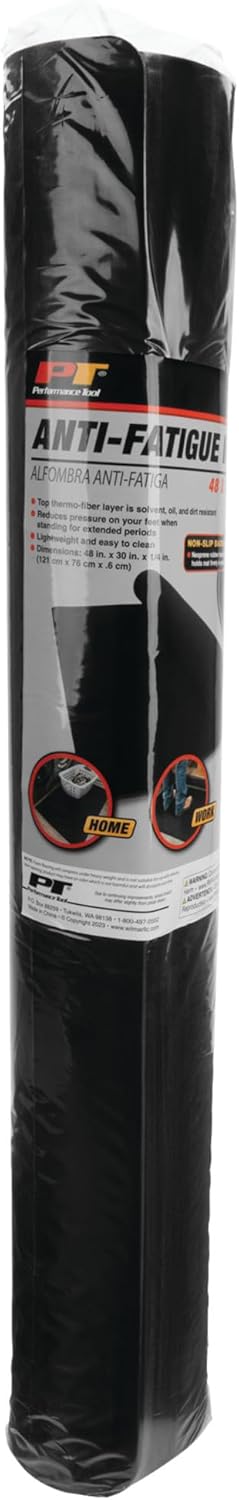 Non-slip neoprene rubber backing holds mat firmly in place for safety and is low profile enough for use as an inside threshold doormat. 1/4 in. Thick mat dramatically reduces pressure on your feet, knees, lower back and insulates your feet from a cold or slick floor. Perfect for anywhere you stand for extended periods of time such as your office, workbench, or kitchen. Top thermo-fiber layer looks great and cleans off easily with a damp cloth/sponge, or gentle sweeping with a broom. High-quality materials used in construction are solvent, oil, and dirt resistant, providing a long service life. Mat is lightweight, flexible and easily rolls up when moving from place-to-place or for storage. Nominal Measurements: 30 x 48 x 1/4 in. thick.