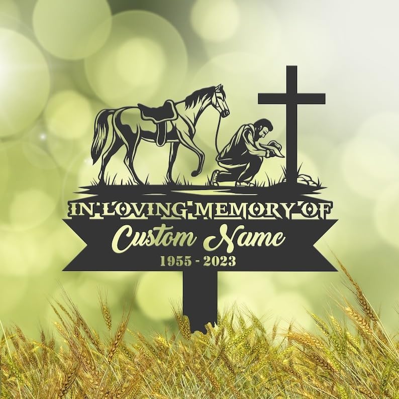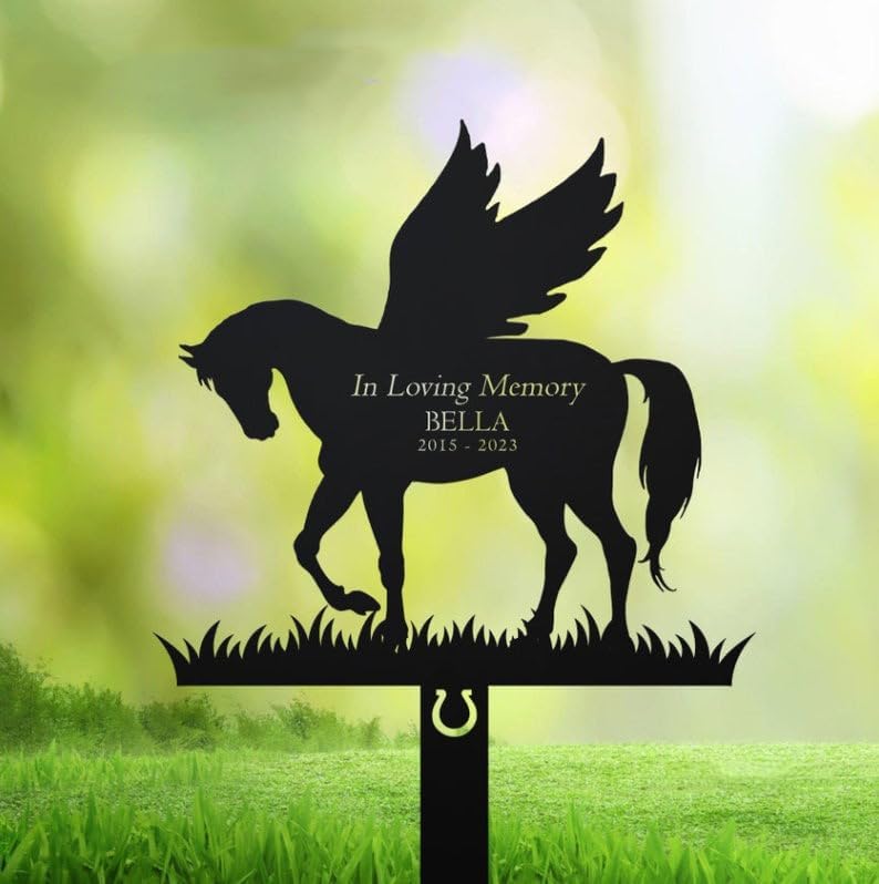 Introducing our "Personalized Memorial Plaques for Outdoors," a heartfelt tribute to honor the memory of your beloved horse. These metal garden stakes serve as poignant grave markers, offering solace and remembrance during times of loss. Crafted with care, these memorial plaques are designed to withstand outdoor elements, ensuring a lasting tribute. Featuring a majestic horse with wings, they symbolize freedom, grace, and the enduring spirit of your beloved equine companion. These memorial gifts serve as symbols of comfort and sympathy, providing a place for reflection and honoring cherished memories. Personalize them with your horse's name or any custom text to create a unique and meaningful tribute. Whether placed in a pasture, at a barn, or in a special outdoor space, these memorial plaques offer a beautiful way to honor and remember your cherished horse.