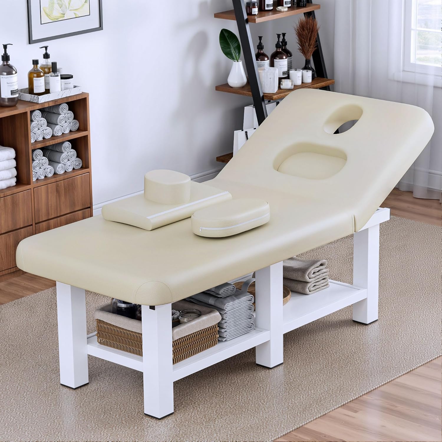 • Large Under-Bed Storage with 70 lbs Capacity :Stationary massage table includes a spacious under-table storage shelf that holds up to 70 lbs, ideal for organizing towels, oils, linens, beauty tools, and spa accessories to keep your workspace clean and efficient