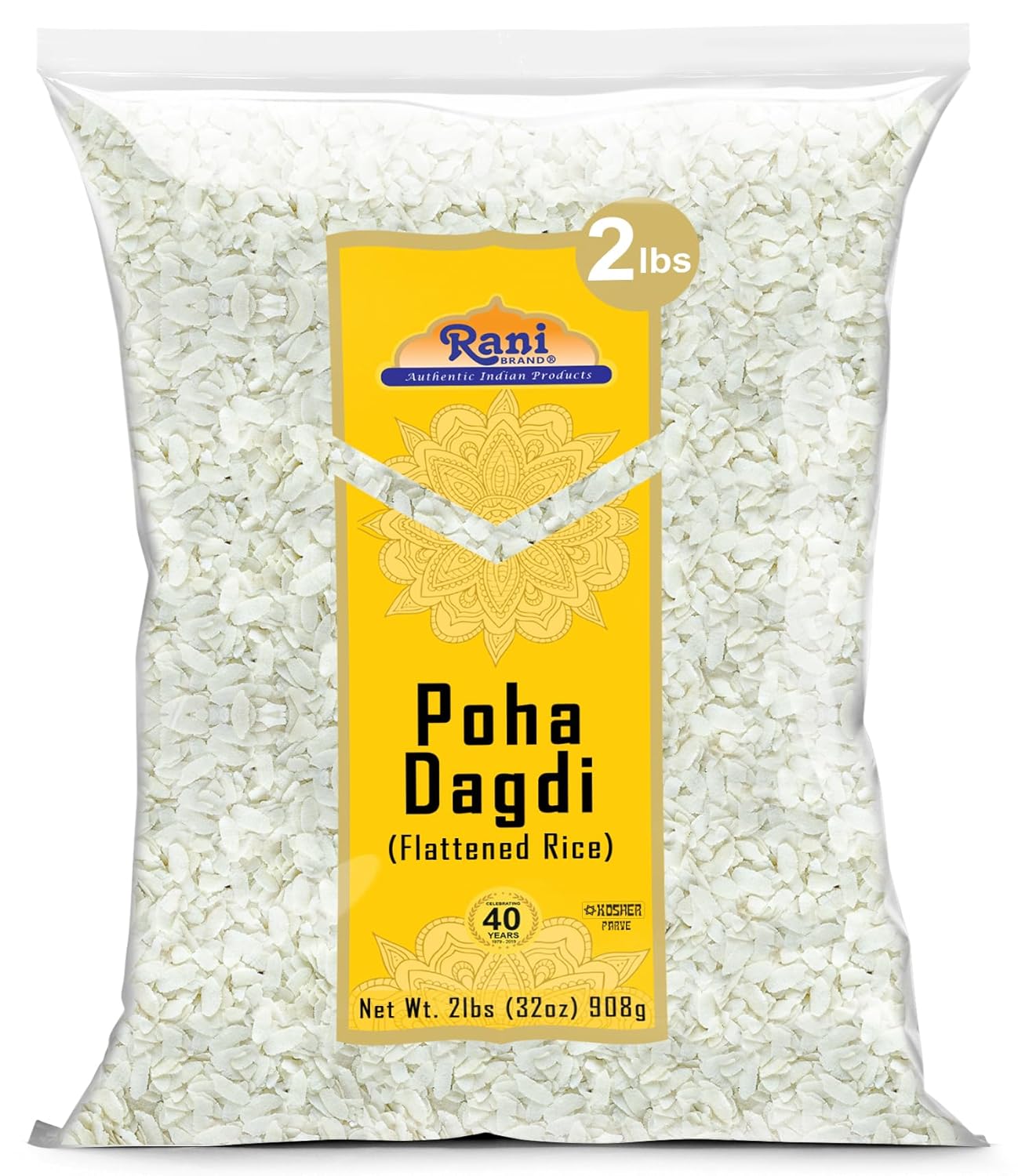 Rani Poha Thick (Medium) Cut Rice flakes are prepared by flattening peeled rice. This flattened rice or pressed rice provides a light, healthy and delicious Indian snack and breakfast dish. Rice is parboiled before flattening so that poha can be consumed with very little to no cooking. These flakes of rice swell when added to liquid, whether hot or cold, as they absorb water, milk or any other liquids. Rani's thick rice flakes are very delicate and can be prepared in various ways – salted, with yogurt, or pressed into schnitzels or tikkis. It is quick to prepare and nutritious. Rani Powa (flattened rice) – Thick is a variety of flattened rice and is suitable for making dishes like Breakfast Pohe, Kanda Pohe Poha (Chivda) is a digestible form of raw rice and is normally used to prepare snacks or light and easy fast food in a variety of Indian cuisine styles Rani is a premium quality, brand for Indian Groceries, Spices and Rice. Rani is a USA based company selling quality foods for over 30 years, buy with confidence!
