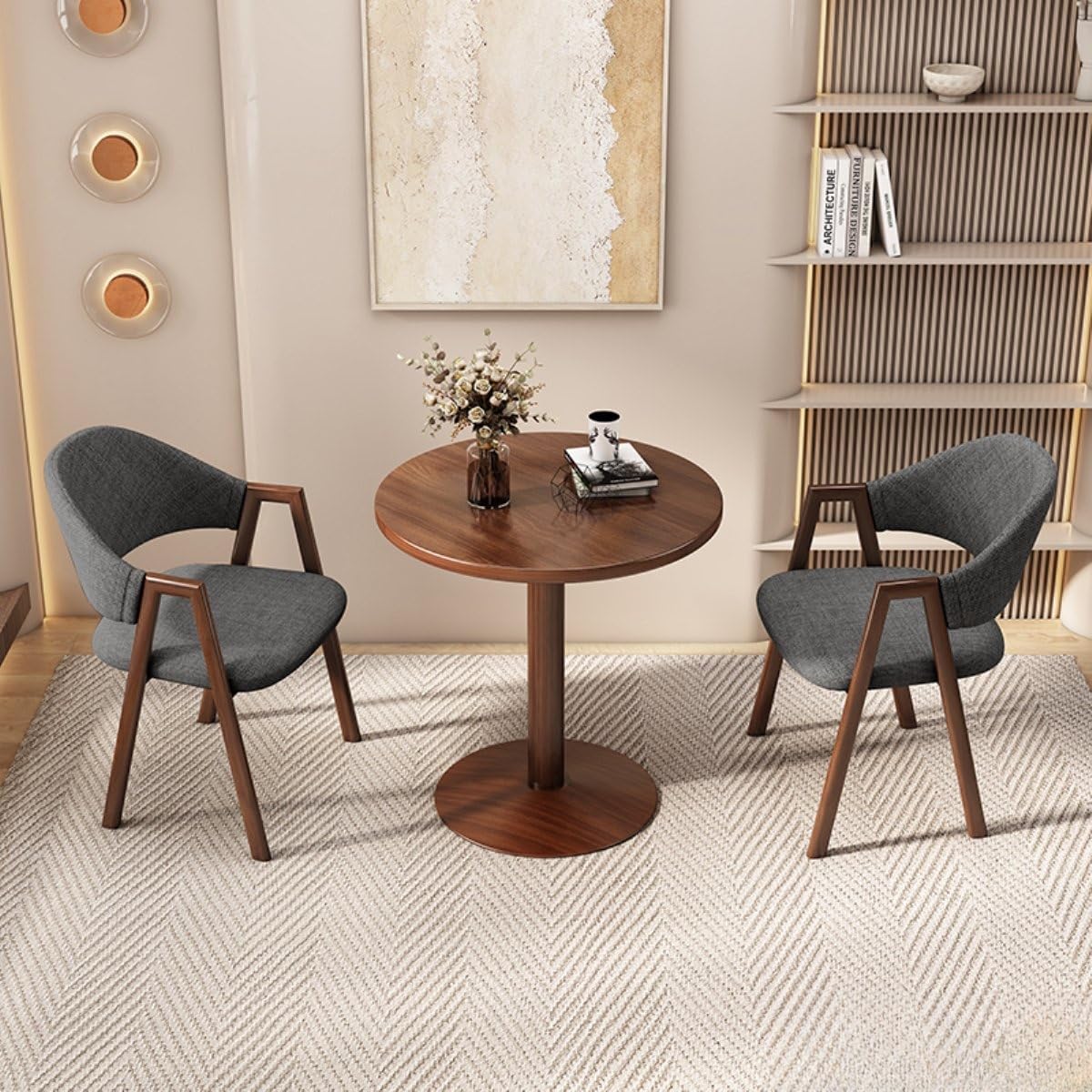 Item Name: Round Reception Desk and Chairs SetTable Size: Diameter 60 x H75cm;Chair Size: L47xW40xH78, Seat Height 45cm Material: Metal Iron Frame, MDF tabletop, Optional PU Leather or Fabric Seat Feature: Sturdy and stylish design, versatile seating options, perfect for comfort during long meetings. Applicable scenarios and occasions: Ideal for offices, lounges, kitchens, living rooms; great for professionals and businesses. Style/Appearance: Modern with a walnut grain finish, sleek metal frame, enhancing any space's aesthetic. Origin: China