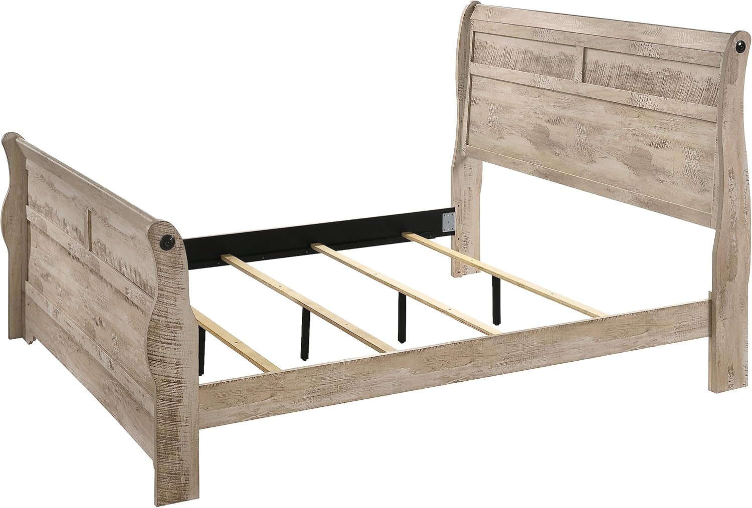 The shabby-chic style of the Imerland Contemporary White Wash Finish Bedroom Set remakes your bedroom with contemporary cool. Designer details include antique bronze metal pulls in the front of the drawers, and the wood patch pattern on the top of the nightstand. Solid hardwoods with White Wash rustic finish provide long-lasting quality construction. Luxurious touches of bun feet, bronze-finished metal accents, wood-framed mirror. The sleigh headboard makes a perfect accent with the warm tone finish and distressed marks. The bed frame includes 4 wooden slats, additional slats, or a box spring recommended to purchase separately.