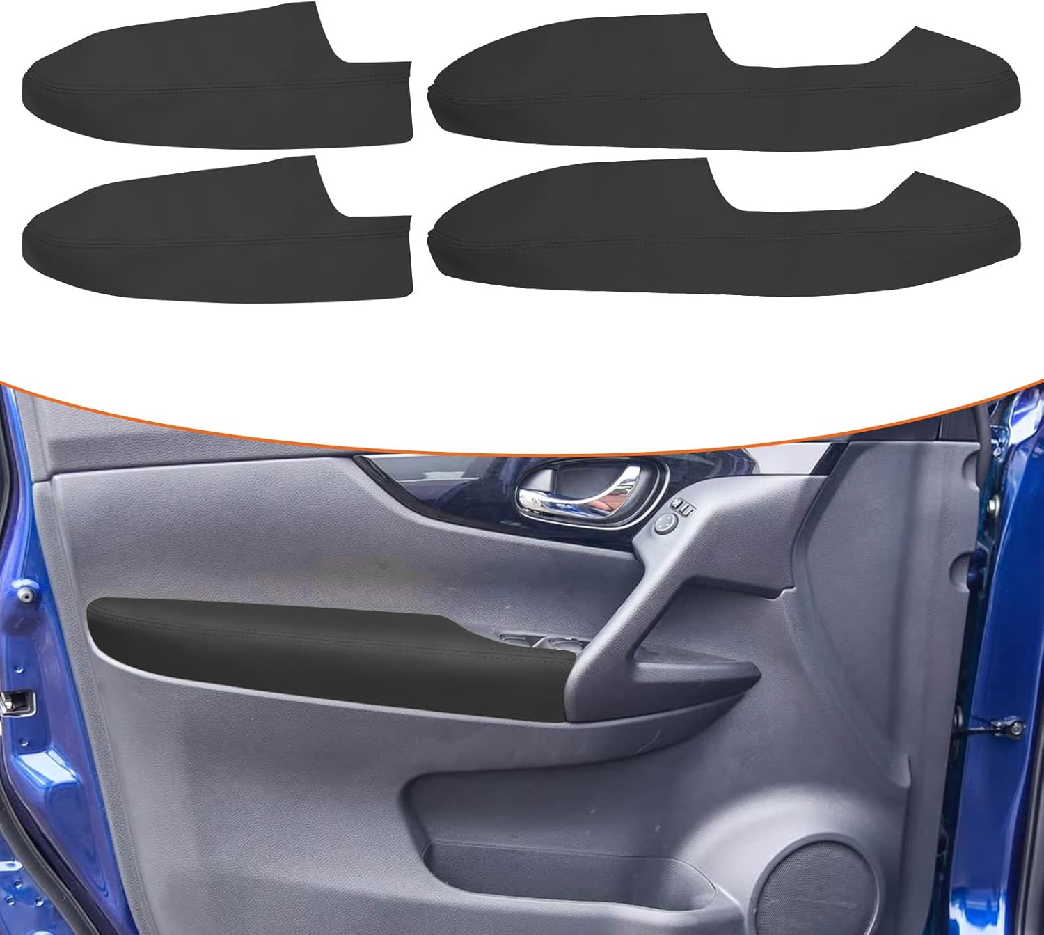 Product Specification: Material:Leather Color: Black Package:4pcs Door armrest leather cover,1x Double-sided tape,1x Scraper,1x Rocking Plate Notice: The product is a replacement part, not an additional installation. Installation tips: 1.Remove the console lid and take off the old leather cover and staples. 2.Place the new leather cover over the lid, aligning the stitching with the edges. 3.Secure the leather firmly using the included double-sided tape. 4.Stretch the leather and use the provided scraper for optimal fit, then trim away any excess material.