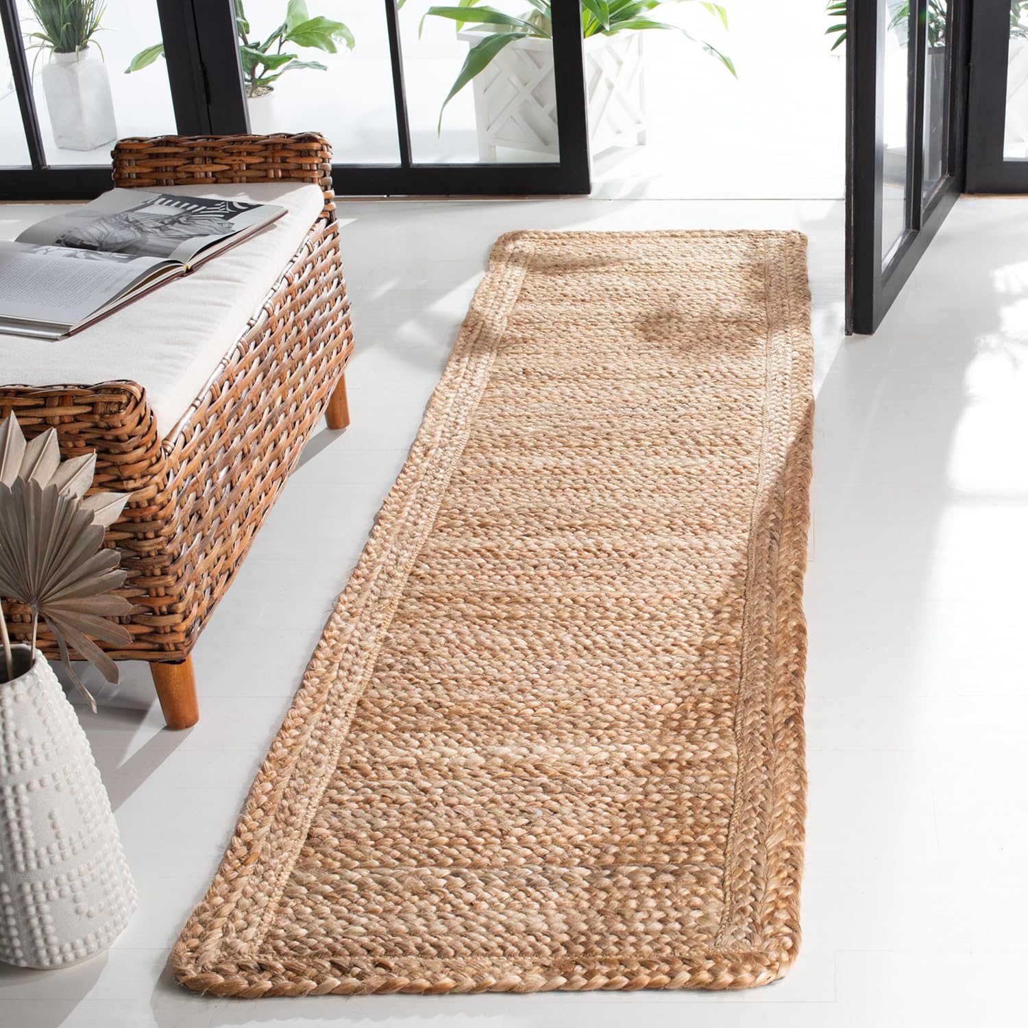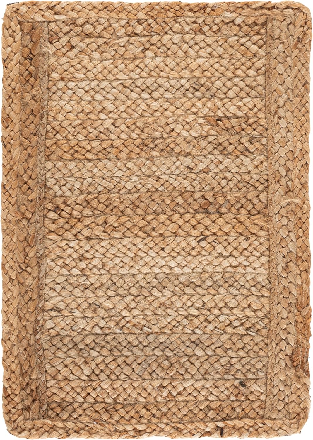Highlighting design and durability, this richly textured natural fiber rug is a beautiful addition to any living space. Chunky jute fibers are hand-woven to create dimension with braided stripes within a braided border for a stylish and unique look. Use as a base for layering below smaller sized flatweave or low-pile rugs for an eye-catching rustic bohemian look and feel.