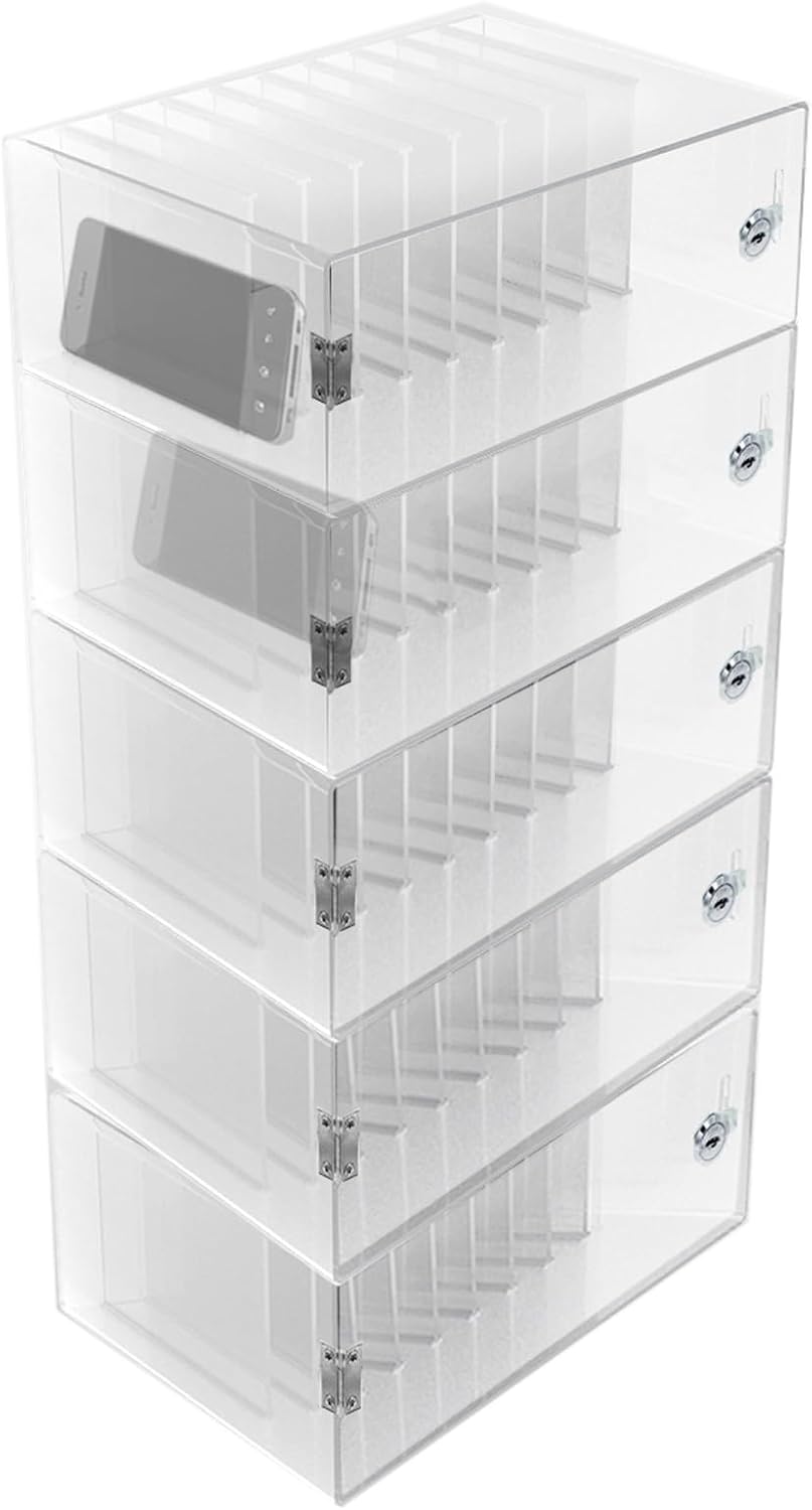 Made from sturdy acrylic material, this cabinet is built to last and resistant to damage. With numbered compartments, it is easy to manage and avoids confusion. You can even personalize each compartment by writing names or numbers in the designated blank areas.For added security, the cabinet features a locking mechanism, ensuring the of your phones. With two charging ports, you can conveniently charge your phones while they are stored, ensuring they never run out of .Specification:Material: AcrylicColor: TransparentShape: RectangularMounting Type: Wall Mount, FreestandingNumber of slots: 10 slots, 20 slots, 30 slots, 40 slots, 50 slotsProduct Size: 10 bits:28x19x10.5cm/11x7.5x4in20 bits:28x19x21cm/11x7.5xx8in 30 bits:28x19x31.5cm/11x7.5x12in 40 bits:28x19x42cm/11x7.5x16.5in 50 bits:28x19x52.5cm/11x7.5x20.5inPackage included:1 * Cell Phone Locker BoxWhether you need a storage solution for home or office, this cabinet provides a reliable and efficient way to organize and protect your smartphones.Invest in our Acrylic Mobile Storage Cabinet today and experience the convenience and peace of mind it brings.