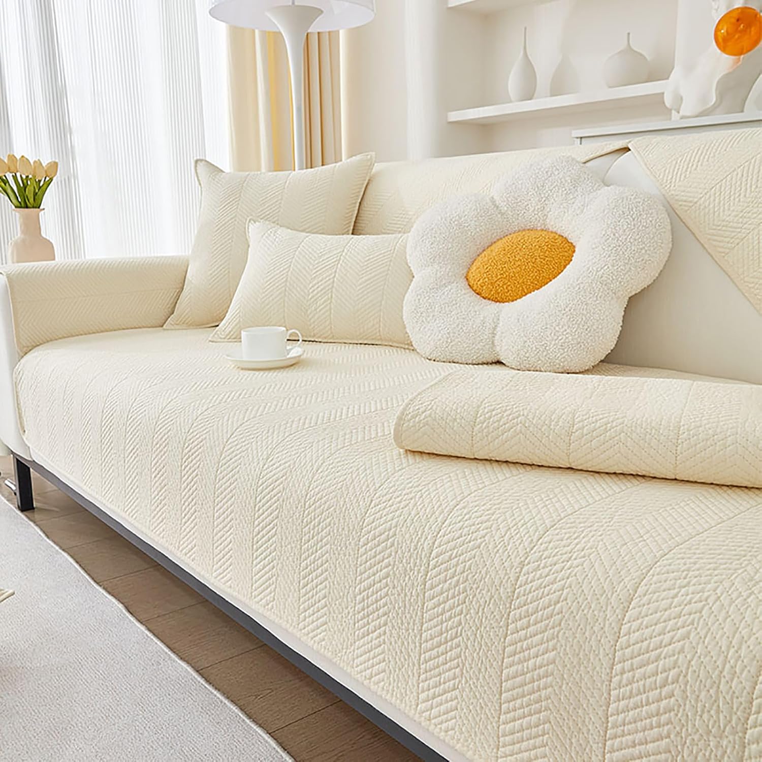 Solid Color Sofa Couch Cover,Soft Cotton Quilted Sectional Couch Slipcover,Non Slip Washable Sofa Slipcover Furniture Protector for Living Room-Beige,1pc-90x210cm