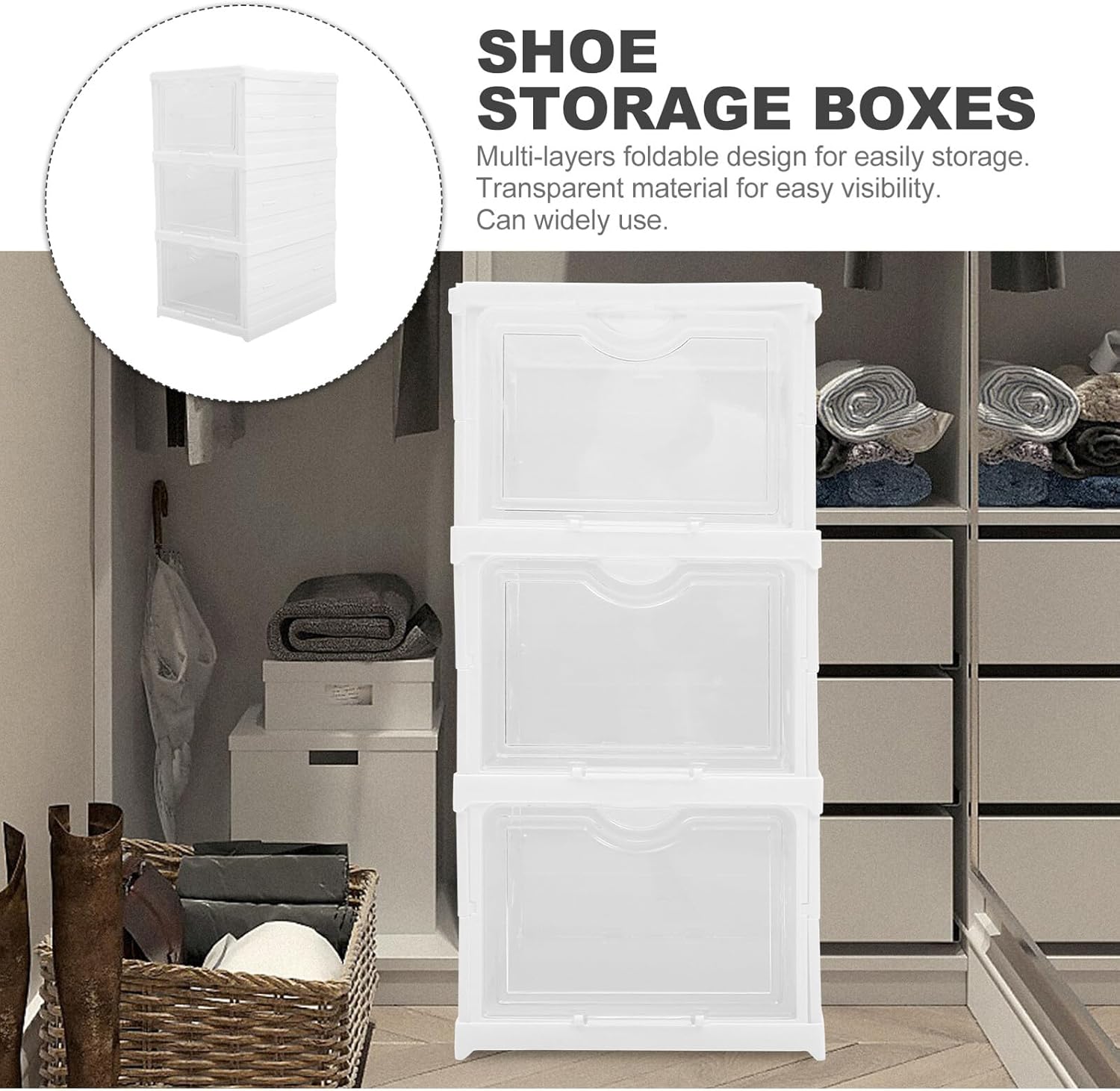 Stackable Shoe Boxes with Lids Foldable Shoe Organizer Storage Container for Closet 3-layer Drawer Style for Entryway and Home Use