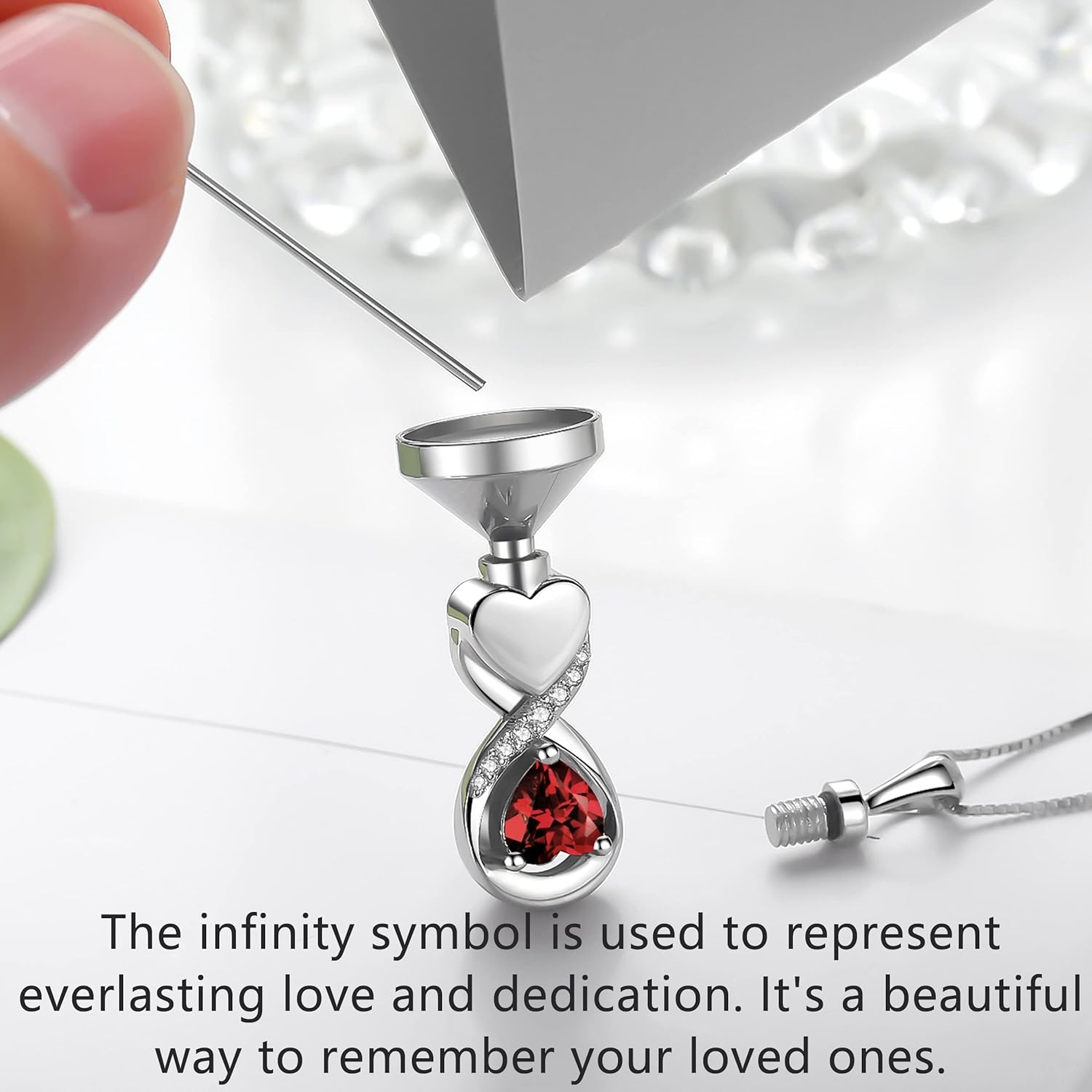Infinity Cremation Jewelry for Ashes - Keep the Most Unforgettable Memories with You Forever!Meaningful gifts for yourself ,family friends or anyone who lost their loved one or pet. Brings you comfort ,peace and courage in future life. This special memorial pendant can also be filled with dried flowers, dirt, hair, perfume, etc.How To Use?1. Prepare the item you need.2. Put the ashes into the funnel.3. Use the pin to help the ashes go inside the hole.4. Finished.Product Features:1.Excellent sealing ability to add more security for the inner items.2.Gift to Dad, Mom or other friends, family members to show their missing to the loved ones.3.Can be hung in car back mirror so that you can be with your loved one wherever you go.Necklace Maintenance1.Jewelry often replaced, the same piece of jewelry, should avoid wearing long time, especially in hot summer, jewelry coating easy to corrosion when long-term contact sweat, so it is best to prepare several pieces as replacements.2.Easy to damage when exposure with chemicals, bathed in the fragrance, chlorine in swimming, And the salt water of the sea, all will cause etch to jewelry plating, so should remove all before a bath or swim.3.Don't overlap, collision chafed, should be stored in the original packaging or in the box of the independent small grid, avoid to scraping surface.4.Regularly clean jewelry, choose soft hair brush sweep clean the surface to remove surface stains.