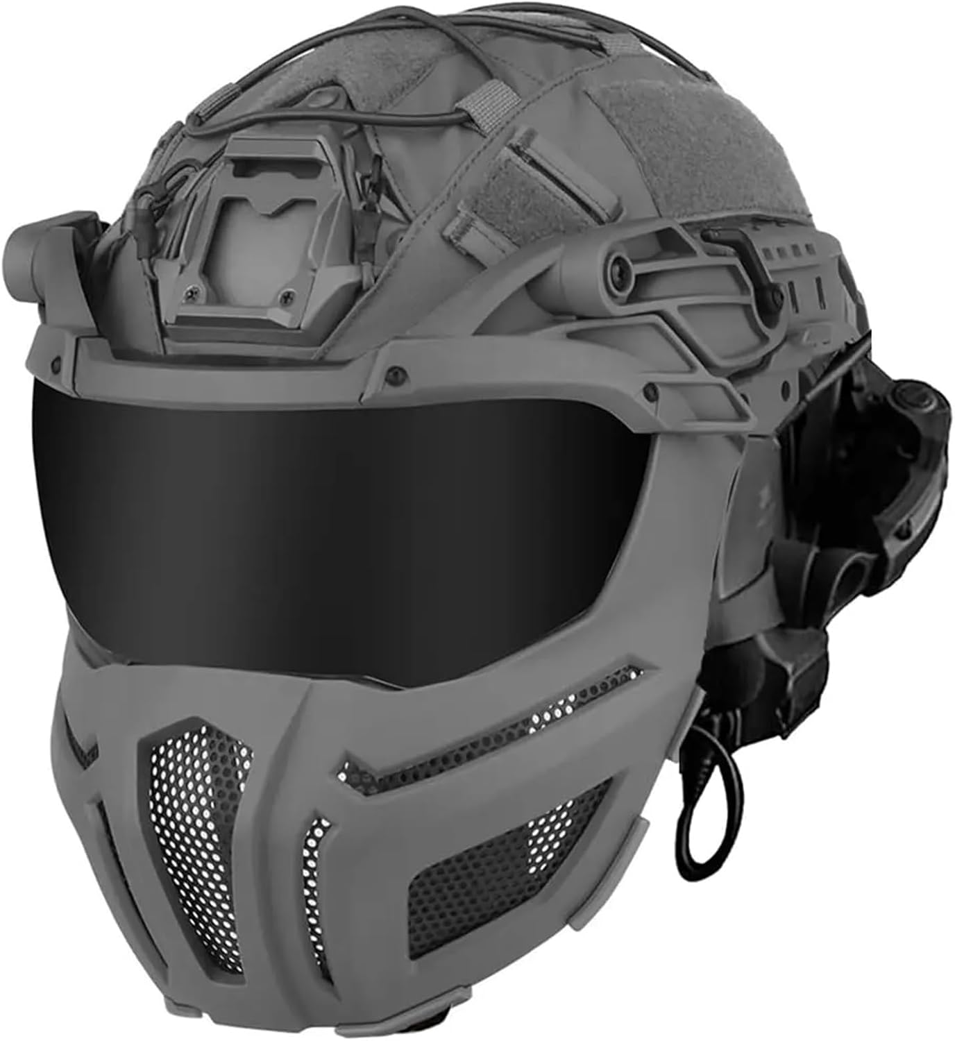 This Tactical FAST Helmet System offers a comprehensive head and face protection solution for high-intensity airsoft, paintball, and CS games, featuring an integrated tactical headset, a detachable protective mask, and flip-up goggles for superior impact resistance. Designed for maximum modularity, the helmet includes side rails, a front NVG shroud, and a loop-panel helmet cover for attaching various accessories such as signal lights, cameras, or patches. The ergonomic interior padding and adjustable suspension system ensure a secure, comfortable fit for extended outdoor use, while the ventilated mask design maintains optimal airflow to prevent lens fogging during rapid movement.
