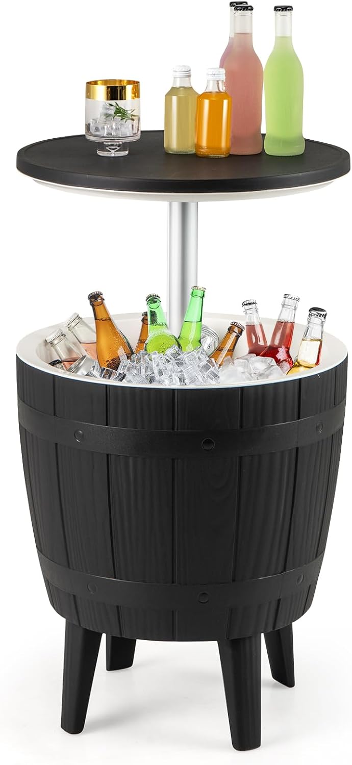 Description:Make the most of your outdoor relaxation with our 3-in-1 Multi-Space Cooler Bar, the perfect addition to any patio or poolside setting. Whether you need an extra side table for serving drinks or a stylish cocktail table for mingling, the pop-up tabletop design allows you to effortlessly transform the cooler bar to enhance your overall entertaining experience. Plus, with a large weight-bearing capacity and 10-gallon storage, it can keep drinks cold for up to 6 hours, making it ideal for gatherings. Plus, the easy-extend tabletop is durable and secure, supporting up to 110 pounds. Moreover, constructed of premium PP material, this cooler bar is built to last with added stability from 4 support legs. Cleaning is a breeze with the user-friendly drain hose design for quick and hassle-free maintenance.Features:Safe locking buckle ensures that the top cover stays in place at its highest point for added safetyAfter being unlocked, please hold the top cover and slowly lower it down Enjoy up to 6 hours of long-lasting cold storage with this cooler tableVersatile 3-in-1 design for multiple outdoor settings and activitiesSpacious 10-gallon capacity holds up to 50 cans for ample storageEasy-to-use extendable tabletop with secure locking mechanism for stabilityDurable construction with sturdy materials ensures long-lasting useLightweight and portable for convenient transportation Stylish and contemporary appearance enhances outdoor decorUser-friendly drain hose design simplifies cleaning and maintenance processProvides ample storage space for drinks, snacks, and other essentialsSpecifications:Color: Brown + WhiteMaterial: PP, MetalOverall Dimension:19" x 23"/33" / 48 x 58/83 cm (Dia x H)Inner Size of the Bucket: 16.5" x 13.5"/42 x 34 cm (Dia x H)Weight Capacity: 110 lbs/50 kgBucket Capacity: 10 Gallon/37 LNet Weight: 13 lbs/6 kgPackage Includes:1 x Cooler Bar Table1 x Instruction